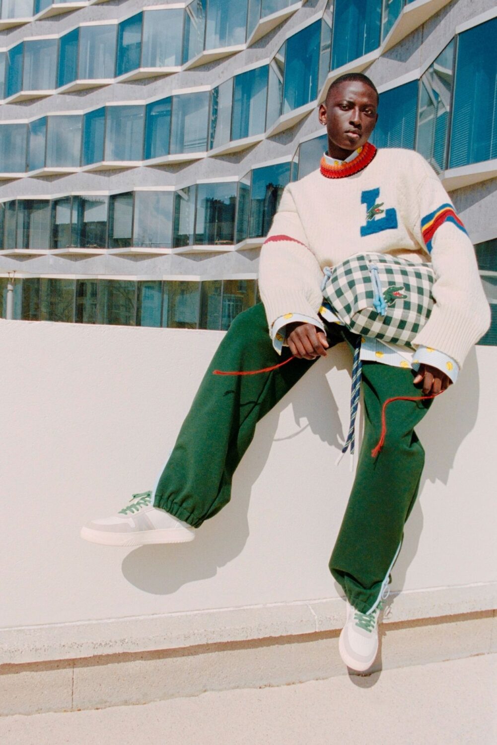 With a swatch card of bright shades grounded in muted neutrals, the collection tricks the eye with blown-up and shrunken proportions, unexpected fabrications, and the emergence of comic Lacoste characters. Like a cartoon, the signature house crocodile is reborn larger than life, as archive claw patches and bold croc heads create a new iconography alongside flaming tennis balls, a ‘tennis net’ shadow check, and an L-shaped varsity logo.