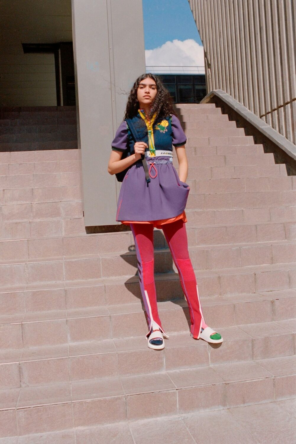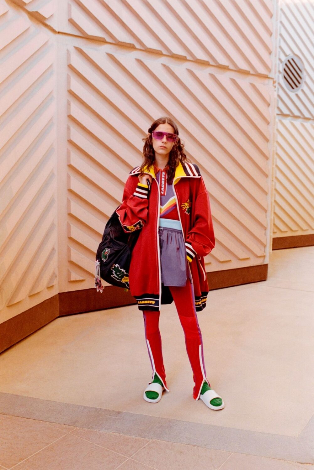 Evolving the upcycled design process of recent seasons, shell suits, puffer coats and quilted liners are reconstructed from a patchwork of vintage and deadstock Lacoste fabrics, creating new geometries in classic sport shapes. ‘Framis’ bonding, drawstrings and oversized rope toggles further the athletic and engineered feel of garments, as do neoprene crop tops and sculpted shorts for women. Crisp unisex chinos feature elastic Velcro cuffs, polychrome leggings in neoprene and patched knit zip high above the ankle, and speed stripes echo the racing aesthetic of checkerboard jacquard polos and trims. Worn with embossed moulded slides, 5-panel cotton piqué caps and oversized rucksacks, they complete the season’s exercise in dynamic sport style.