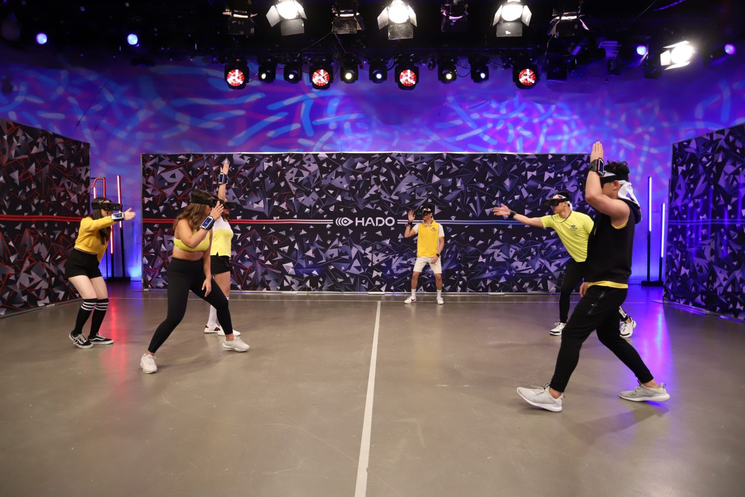 Each team player wears a Hado head-mounted display and a side arm device. These enable them to get into the game, throw virtual energy balls, and pull up their shields.
