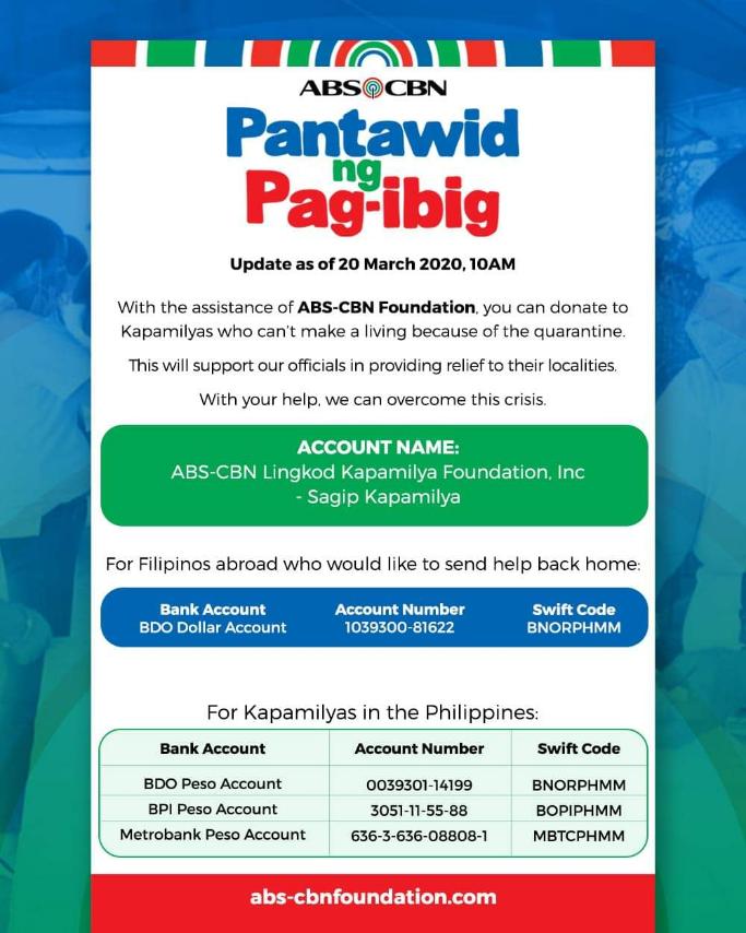 Those who would like to help may make a cash donation through ABS-CBN Lingkod Kapamilya Foundation Inc.-Sagip Kapamilya bank accounts BPI peso account 3051-11-55-88, Metrobank peso account 636-3-636-08808-1, BDO peso account 0039301-14199, and BDO dollar account 1039300-81622.