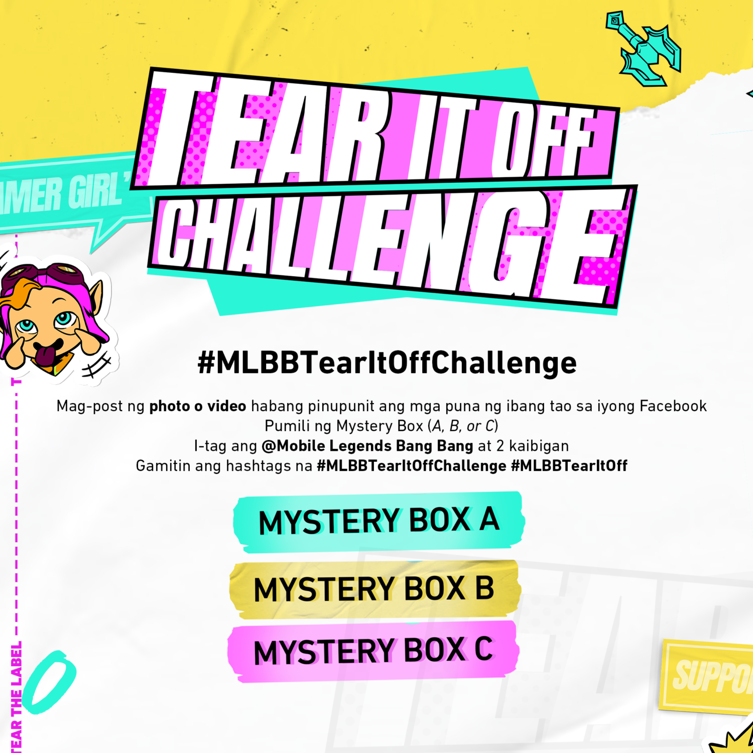 In the caption, mention Mobile Legends: Bang Bang’s official Facebook account and tag two (2) friends to join. Use the hashtags #TearItOffChallenge #MLBBTearItOff. Winners will be announced through the Mobile Legends: Bang Bang Philippines Facebook page on March 10th, 13th, and 16th. All entries will be judged on confidence (70%), creativity (20%), and obedience to rules (10%).