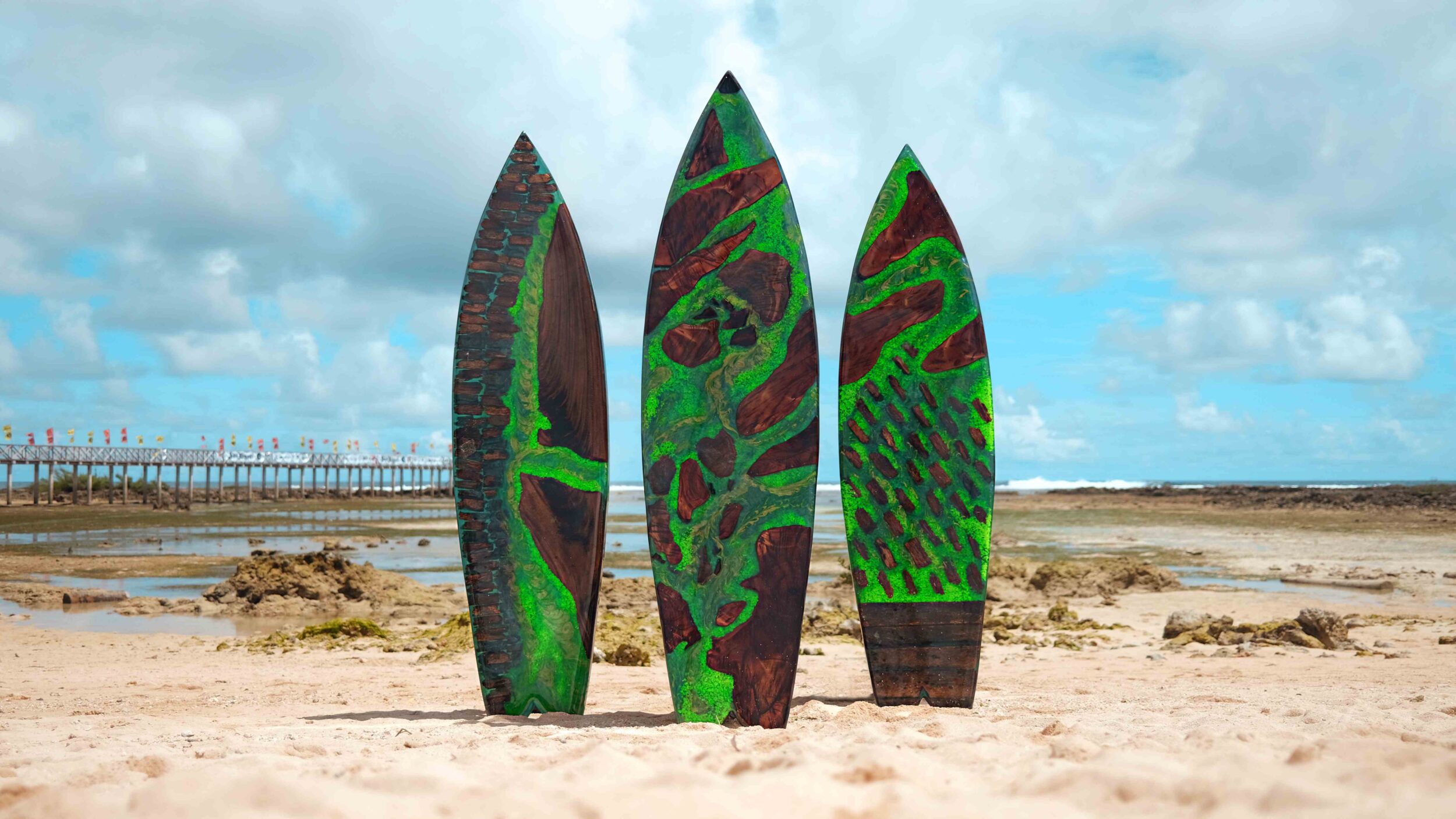 On the anniversary of super typhoon Odette, an additional five Scrapboards were crafted in the shape of full-size surfboards, with each one inspired by an iconic location in Siargao.