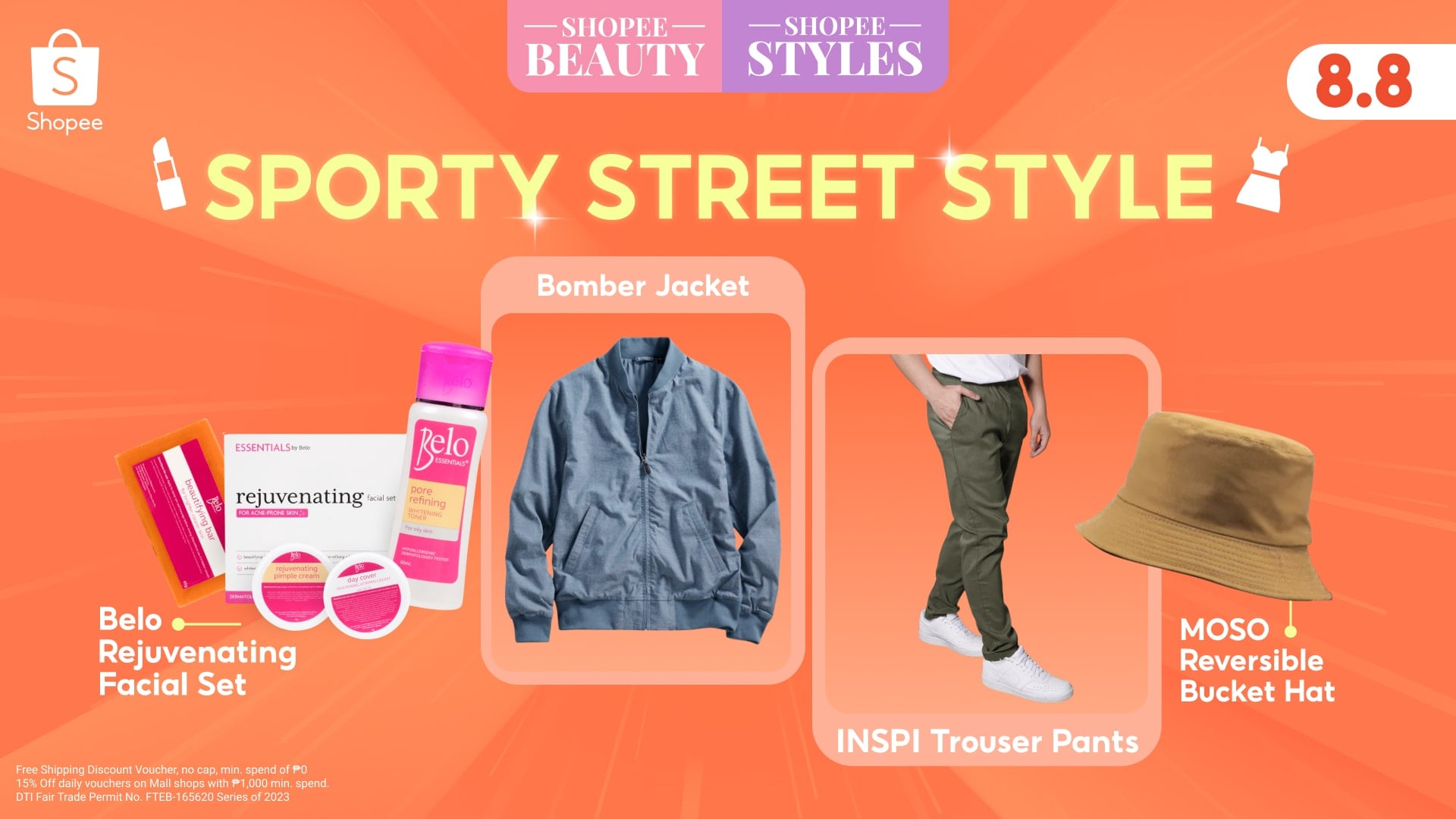Check out the selections ranging from outfits to skincare essentials: BELO Rejuvenating Facial Set, Bomber Jacket, INSPI Trouser Pants, and MOSO Reversible Bucket Hat.