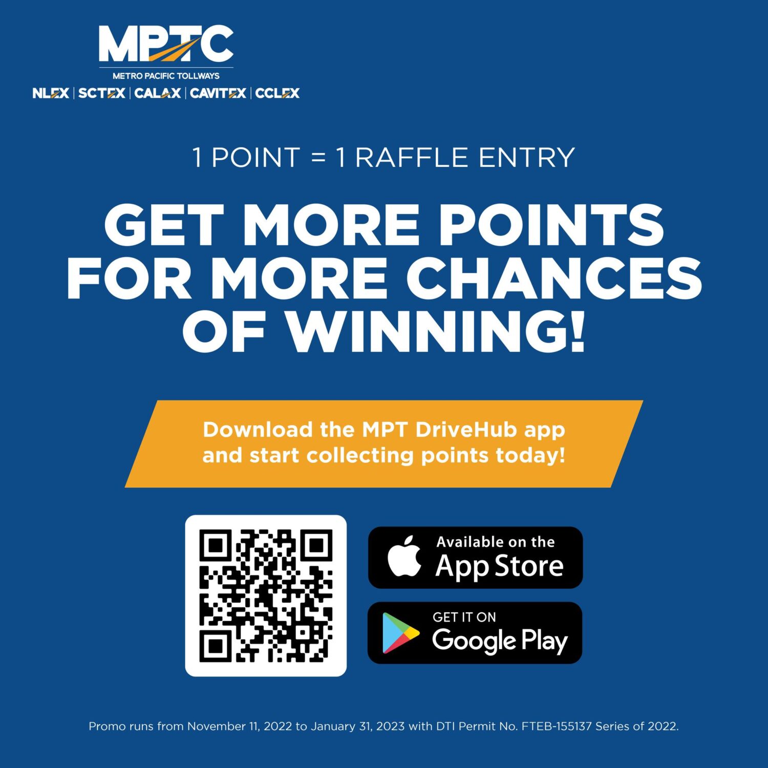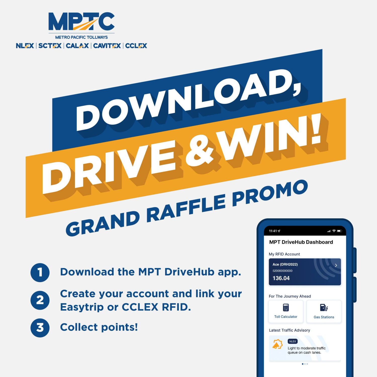 Joining the promo and earning points are as easy as using the MPT DriveHub app! Current customers with Easytrip or CCLEX RFID are automatically in the running when they download the app via the App Store or Google Play Store. The app can be used across all MPTC expressways: CCLEX, NLEX, NLEX Connector, CALAX, SCTEX, and CAVITEX.