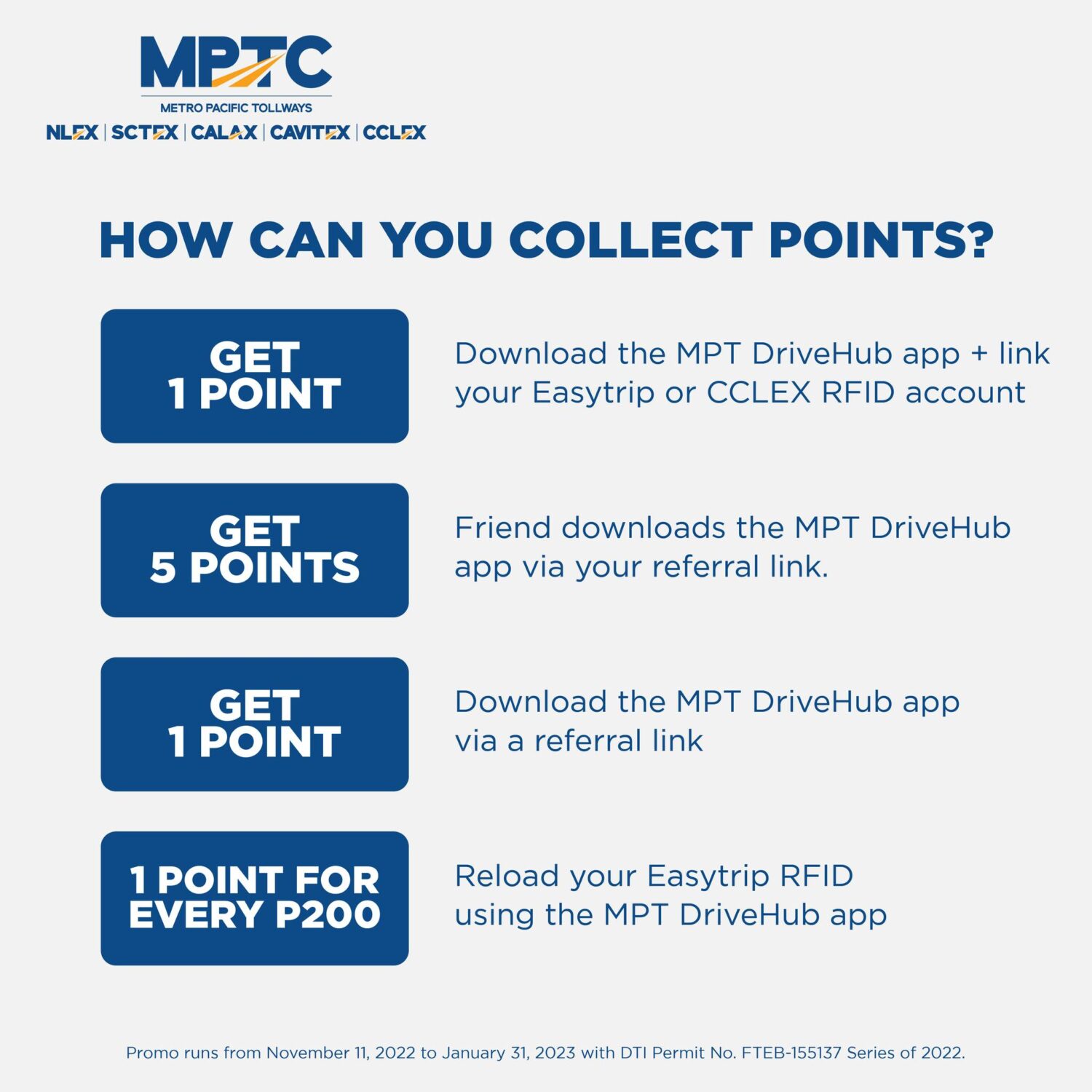 Reloading their Easytrip or CCLEX RFID (1 point for every Php 200 spent, non-cumulative) or referring a friend by using the link (5 points) are two additional ways for them to accrue more points. Through the referral link they received, new MPT DriveHub referrals make money (1 point). Up until the promotion’s end, there is a monthly cap of 24 points, with each point equaling one entry.