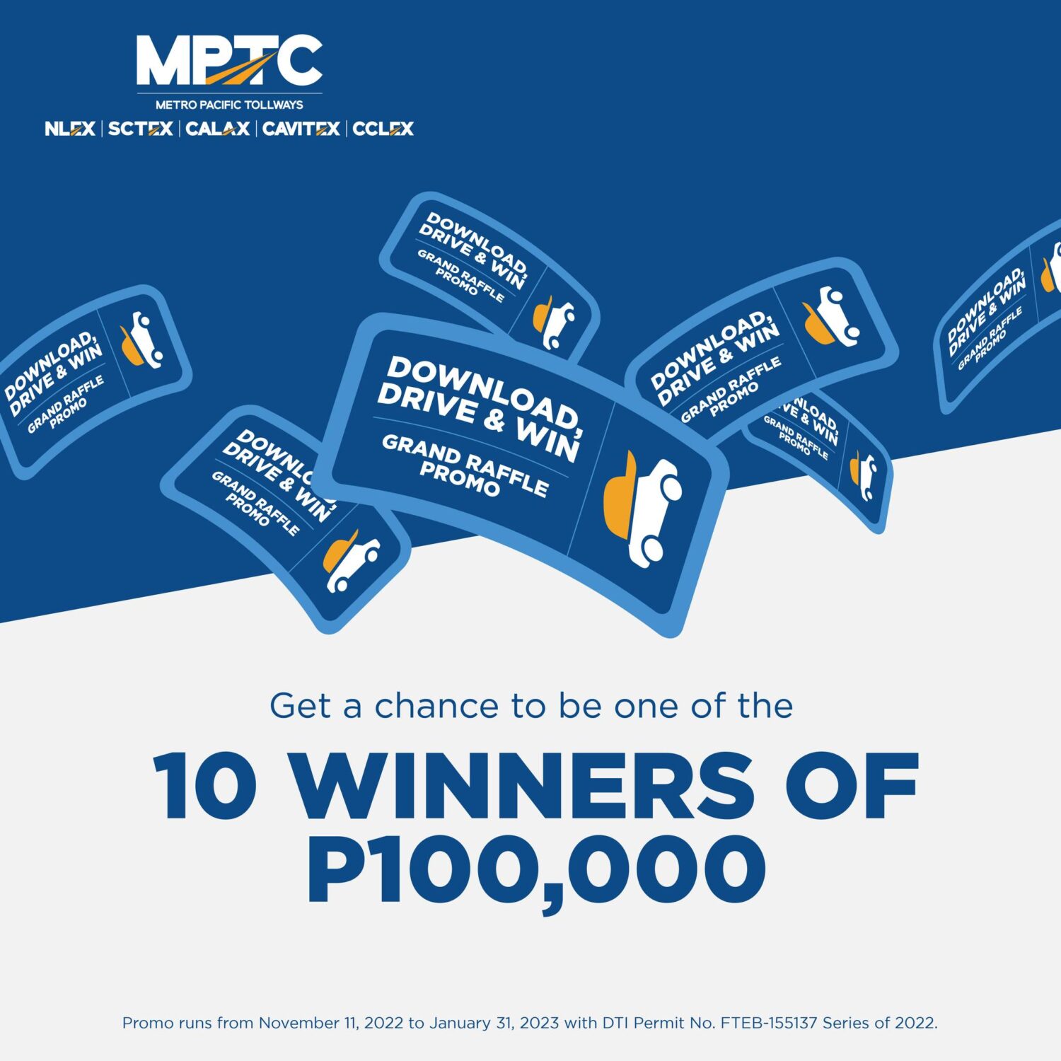 MANILA, Philippines—With their promo: Download, Drive, and Win through their latest application, MPT DriveHub, the Metro Pacific Tollway Corporation (MPTC), operator of CCLEX, CAVITEX, CALAX, NLEX, NLEX Connector, and SCTEX) and MPT Mobility are holding a holiday raffle.