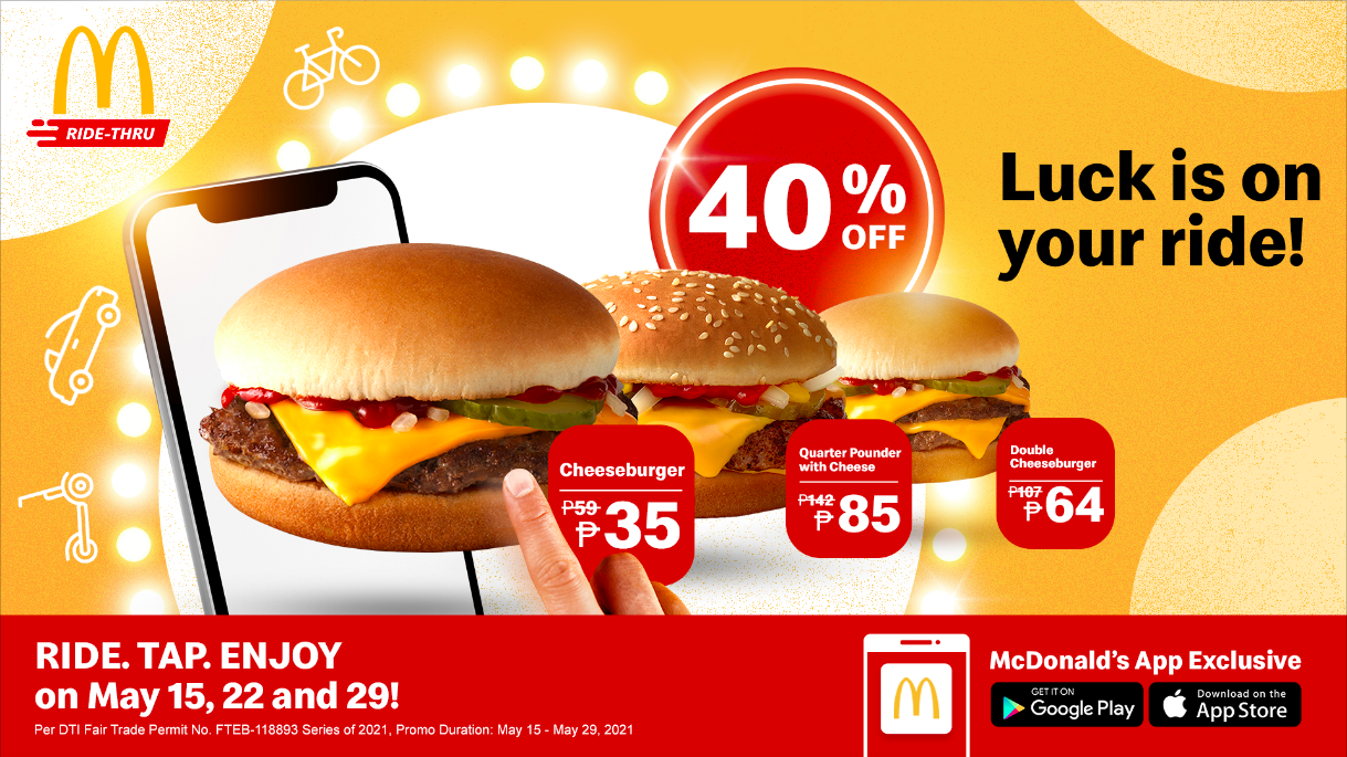 PHILIPPINES — Drivers rejoice because McDonald’s is saying, if there’s a wheel, there’s a way! On May 15, 22, and 29, 2021, lucky customers can enjoy their favorite burgers with big discounts with McDonald’s Lucky Ride Promo.