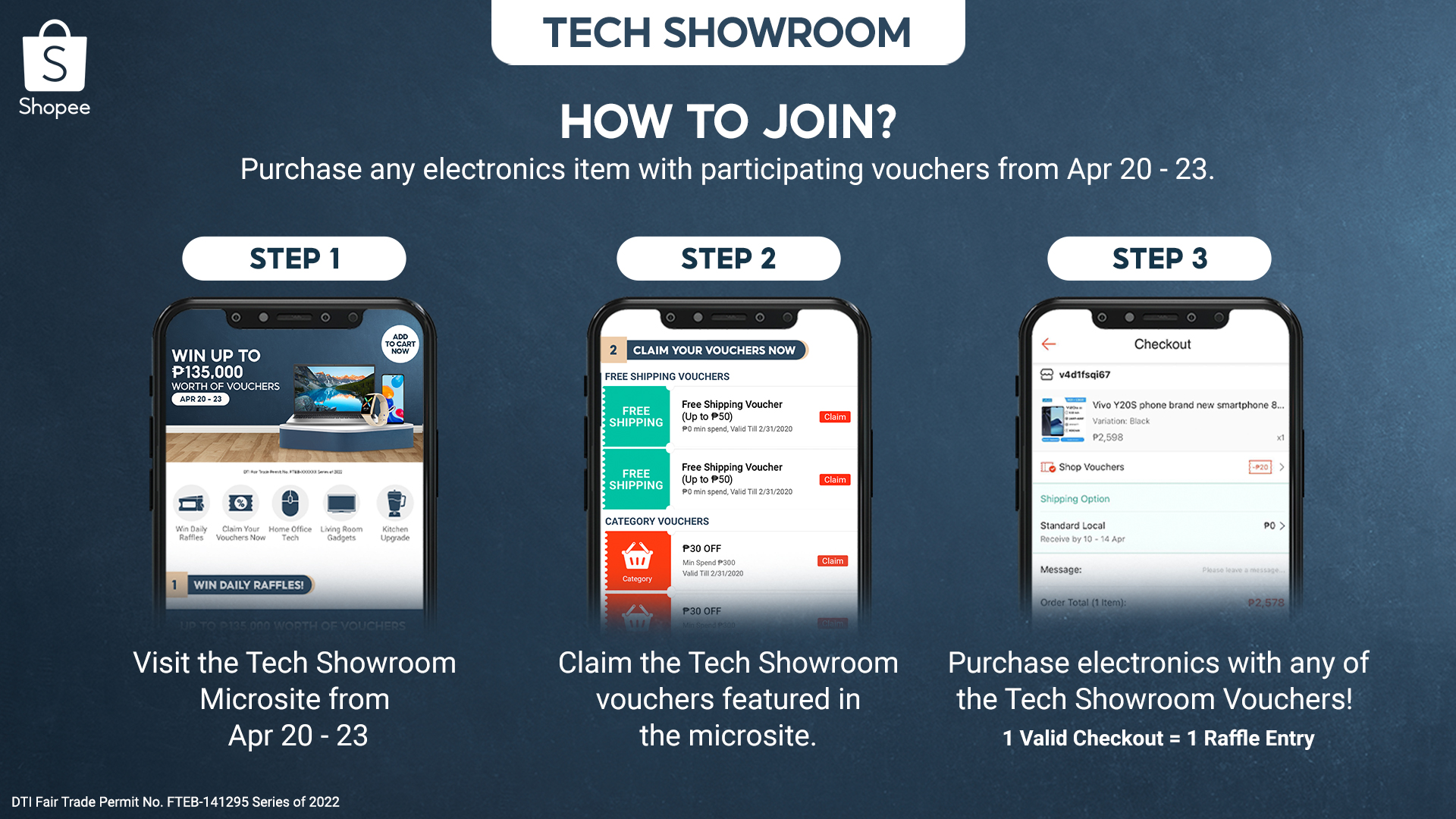 From April 20-23, 2022, users who purchase electronics products using any of the Tech Showroom vouchers will get one raffle entry. These vouchers are available on the Tech Showroom microsite on Shopee and can be claimed daily. Make sure to apply your claimed voucher when you complete your purchase. Only those who have utilized the vouchers, and successfully paid and received their orders on or before May 5, 2022 will be eligible for the giveaway.
