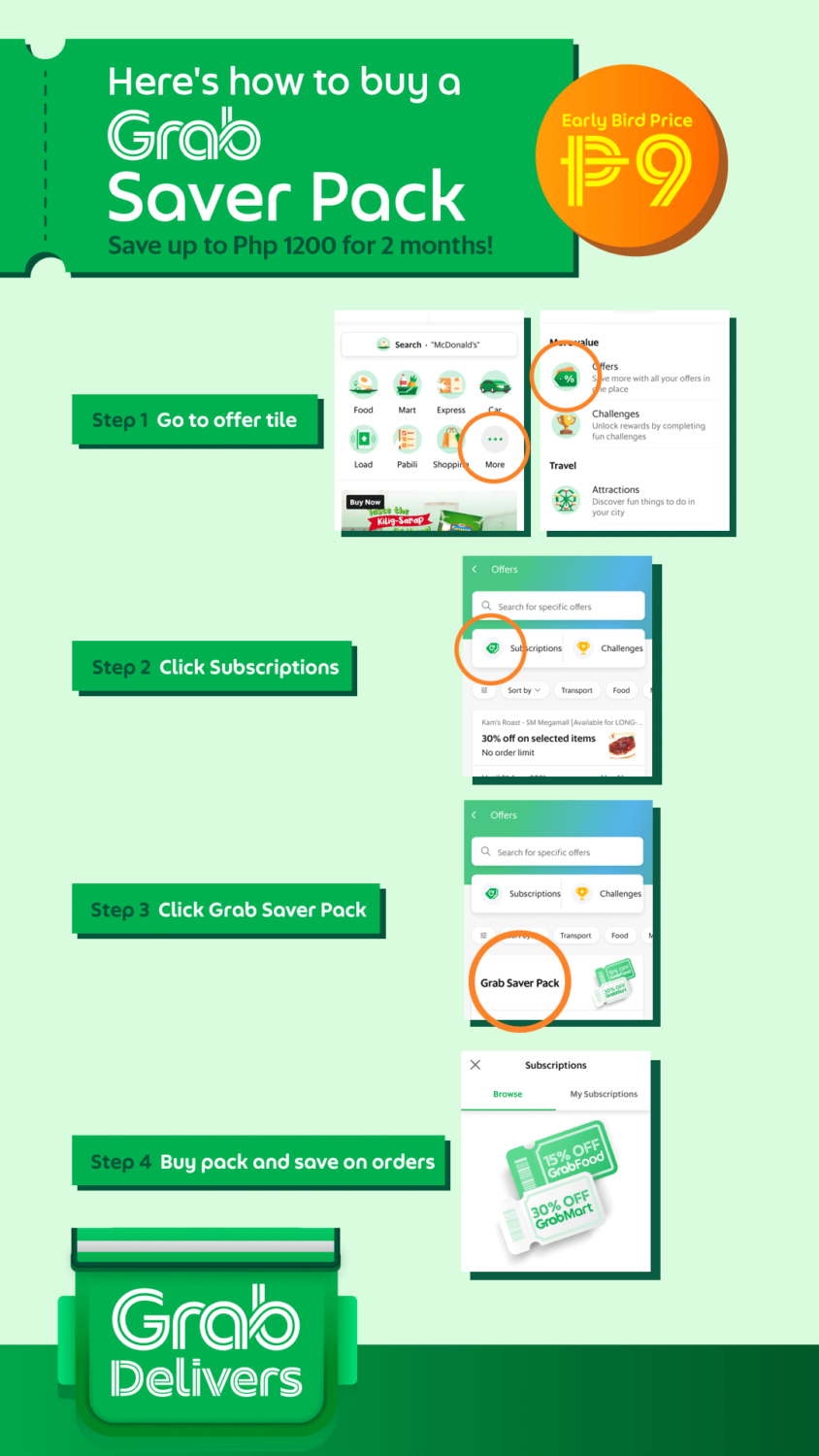 Don’t miss out on your chance to avail of the Grab Saver Pack! Buy your Grab Saver Pack from the Grab app to get exclusive promos and discounts on GrabFood and GrabMart!