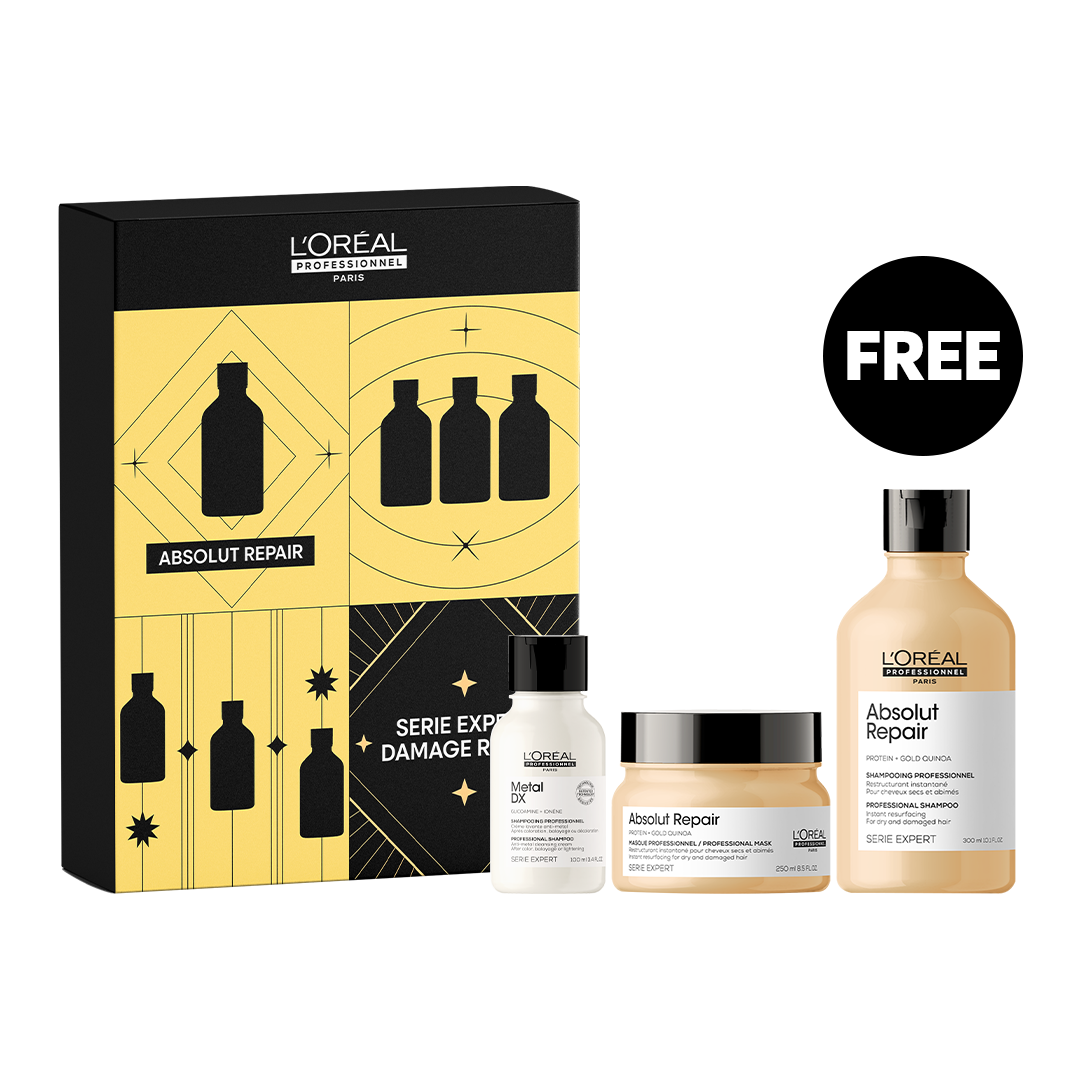 Meanwhile, the Absolut Repair Gift Set boasts a travel-size Metal Detox shampoo, Absolut Repair mask, and a complimentary full-size Absolut Repair shampoo—working harmoniously to mend damaged hair and deliver up to 7 days of unparalleled softness. Tailored for those aiming to rejuvenate their hair’s health and luster after a year of styling and coloring, this L’Oréal Professionnel line precisely targets each part of the hair fiber to treat damage.