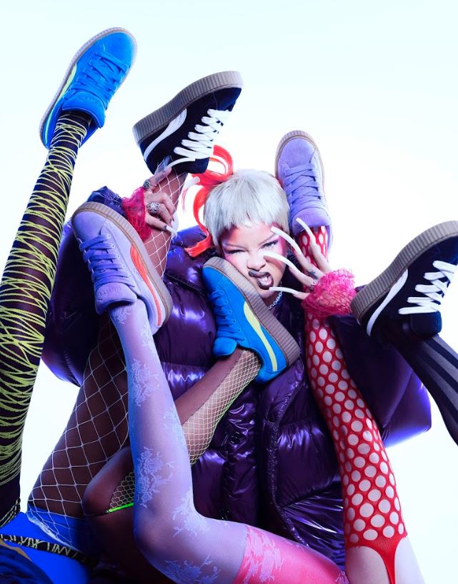 As part of Rihanna’s second FENTY x PUMA campaign, shot by Philippa Price, the imagery captures the juxtaposition between a “creep” and a “phatty” attitude, emphasizing the oversized and vibrant elements of the shoe.