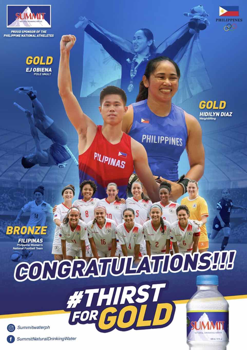 MANILA, Philippines—Waving the Filipino flag proudly, Olympic gold medalist Hidilyn Diaz, Asia’s best pole vaulter Ernest John Obiena and the Philippine Women’s National Football Team fueled their #ThirstForGold at the recently concluded 31st Southeast Asian Games in Vietnam with Summit Natural Drinking Water behind their backs with every lift, leap and kick.