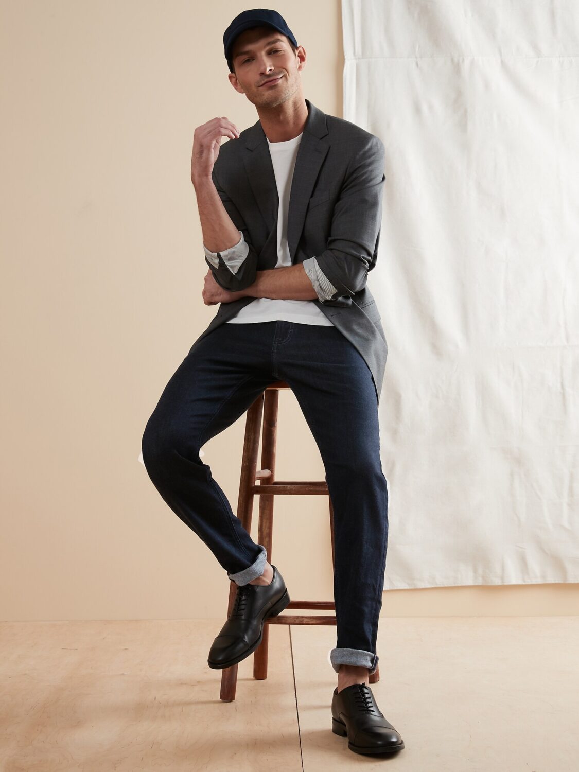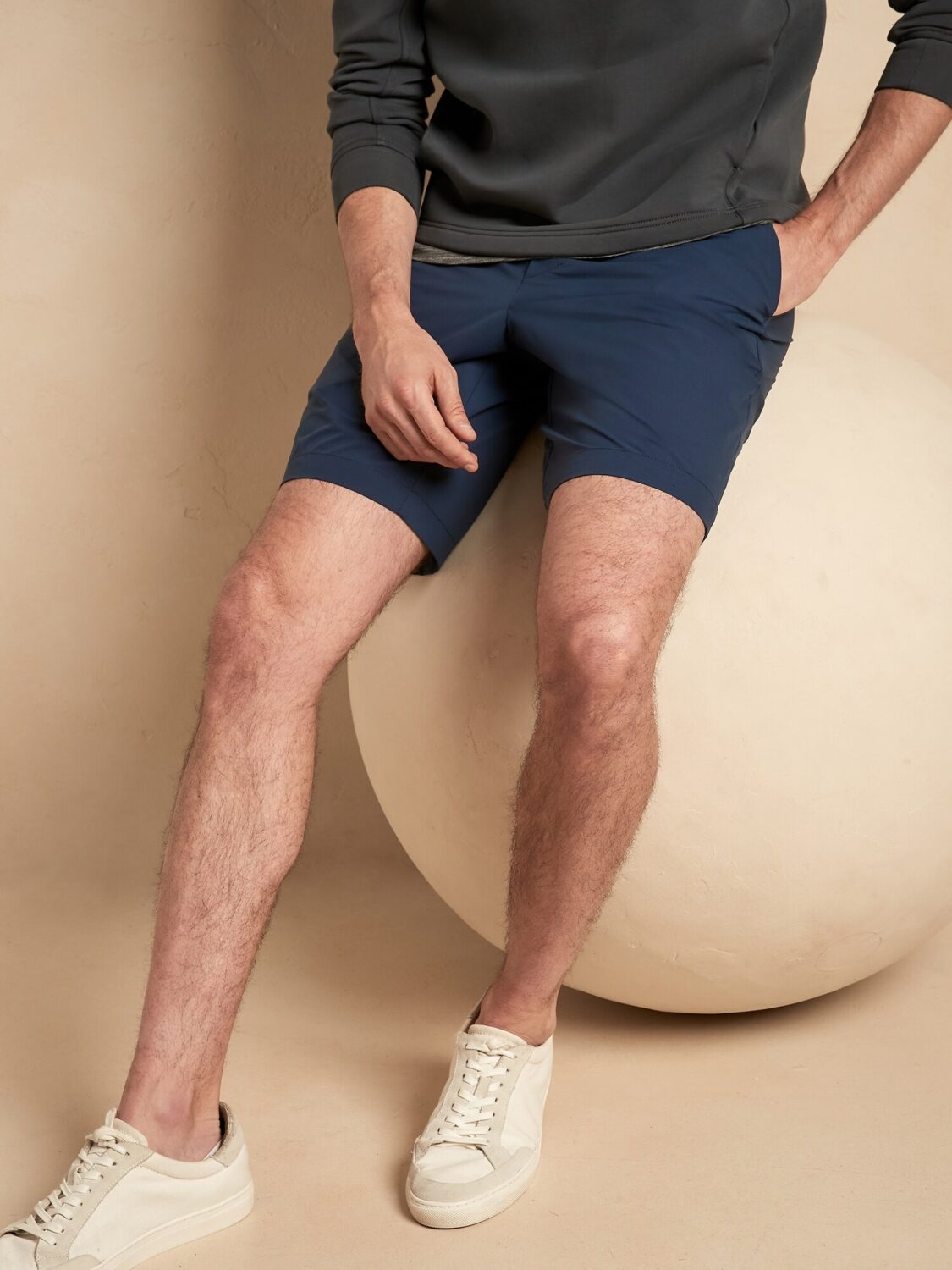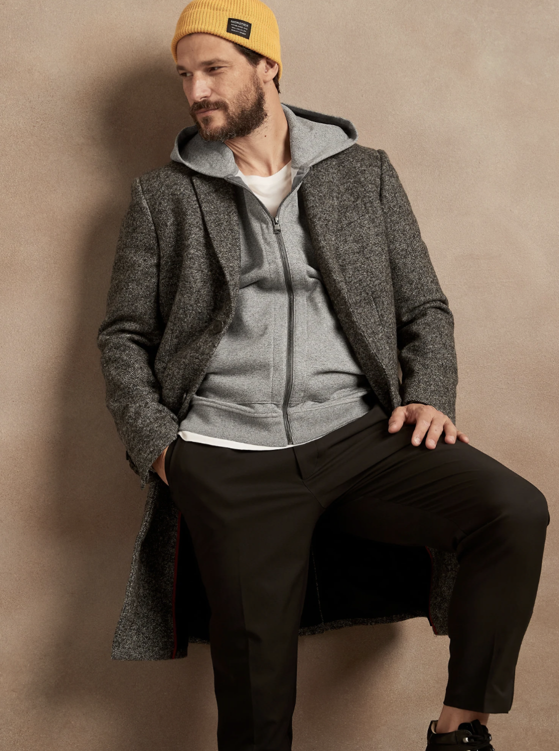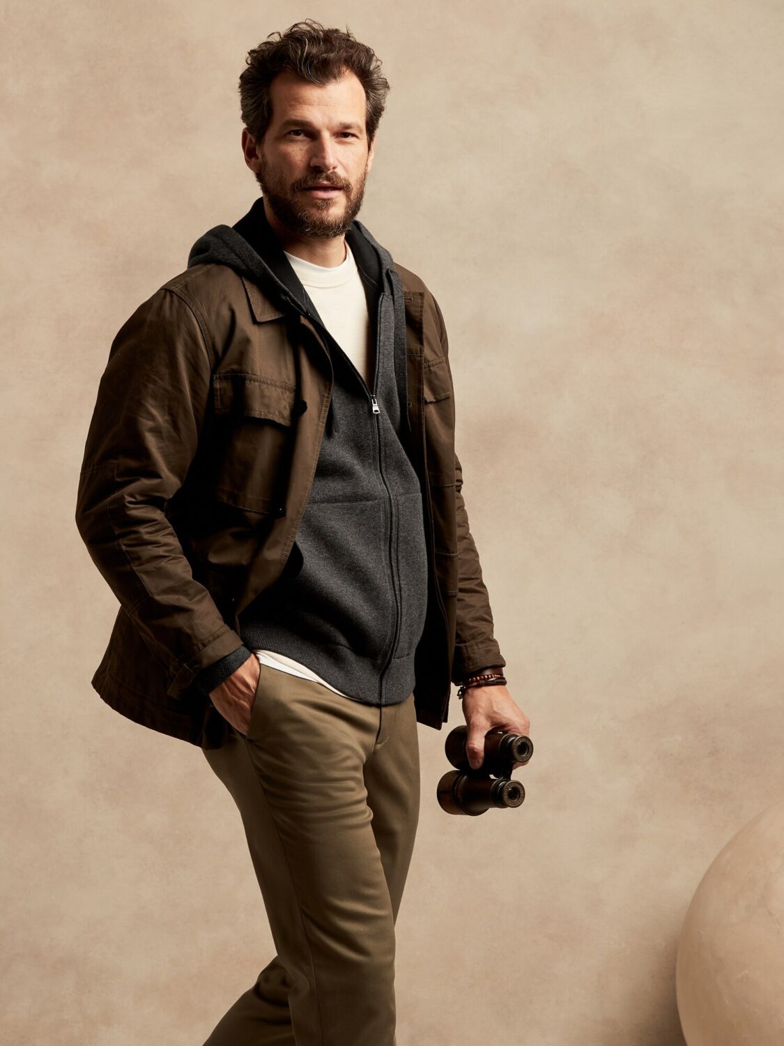 Men’s Sustainable Styles include Motion Tech Short, Motion Tech Jogger, Organic French Terry Hoodie Sweatshirt, Double-Knit Zip Sweater Hoodie, Untucked Standard-Fit Double Weave Shirt, Authentic SUPIMA® Crew-Neck T-Shirt, and Slim Luxe Traveler Rinse Wash.