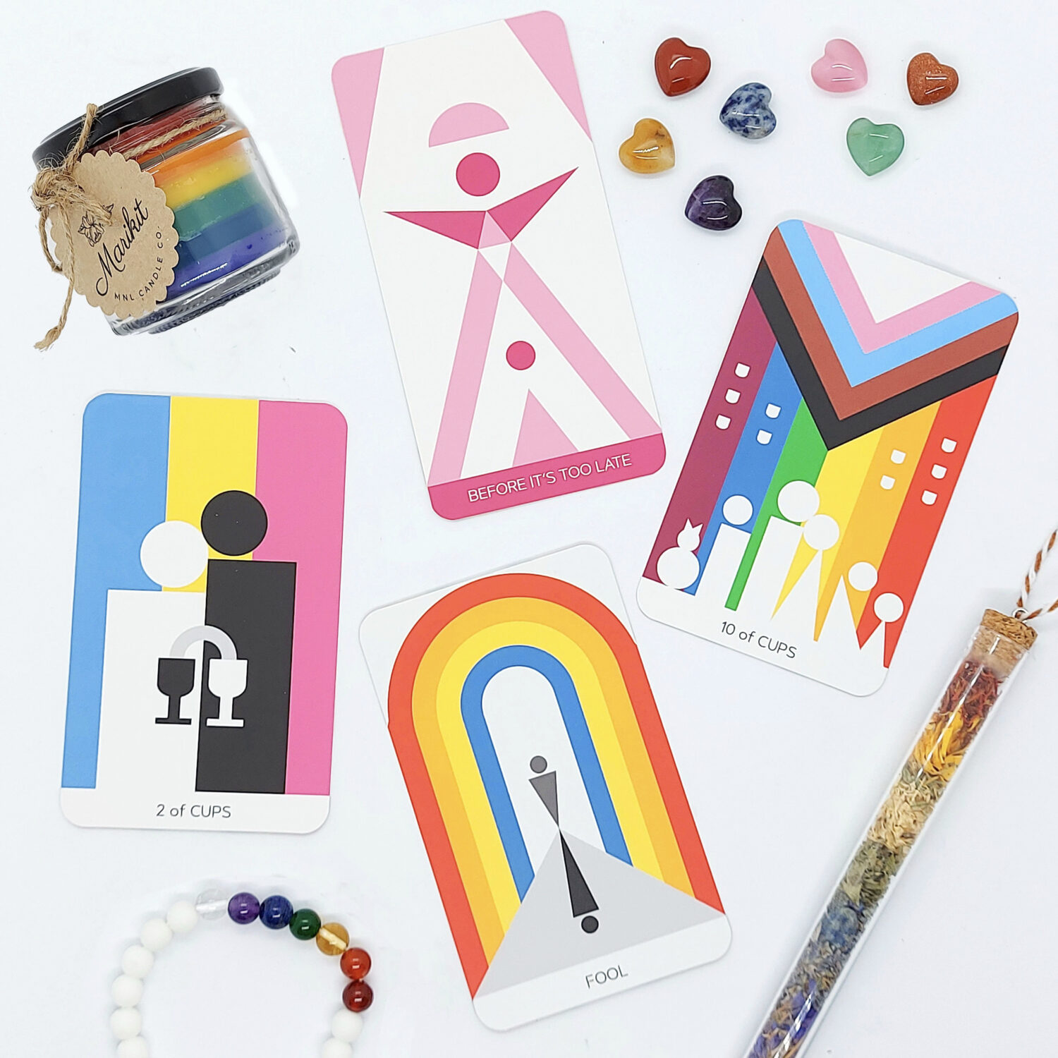 In the spirit of Pride, launching the Rainbow Seekers Tarot became a community effort. People in and out of the tarot community came together to help promote the deck. Thanks to allies, the Rainbow Seekers Tarot also has special sets with crystals, spell jar, candle and bracelet – all rainbow themed! These magical rainbow items are from Chakras.ph, Eclectic Femina PH, Marikit MNL Candle Co., and House of Mystics.