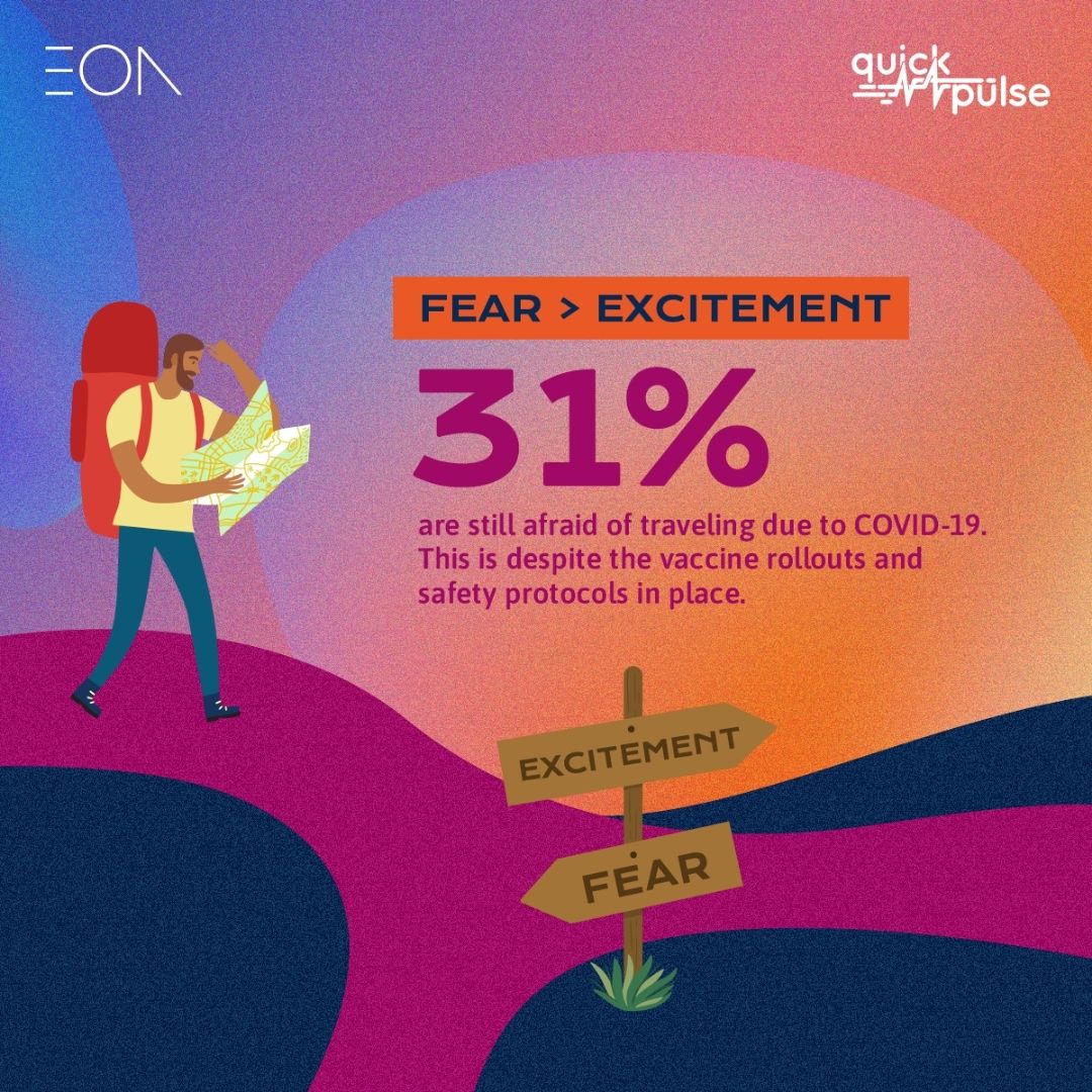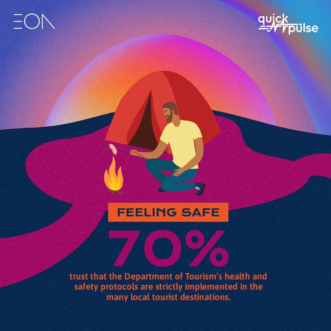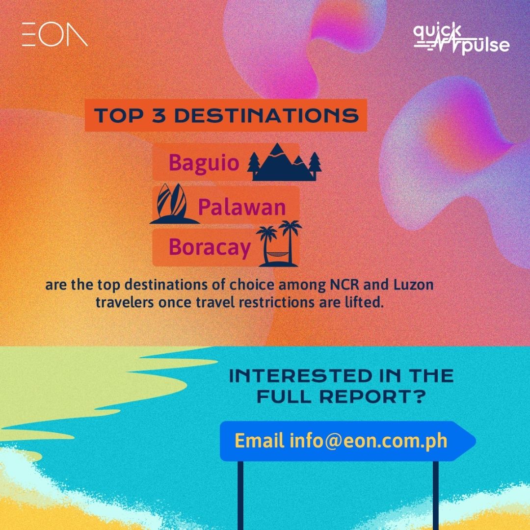 But due to the mobility restrictions imposed by the pandemic, the Philippine tourism industry has been at a complete standstill since last year. This led EON Trust Central (ETC), in partnership with market research firm Tangere, to conduct and publish the Quick Pulse study Zooming in on the Filipino Traveler, which aims to unveil the Filipinos’ sentiments regarding travel and the reasons behind their reluctance to go on trips amid the ongoing pandemic.