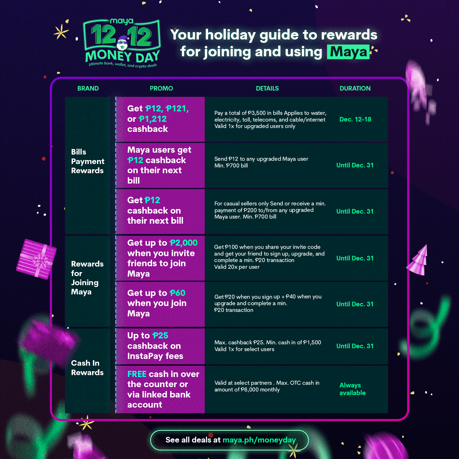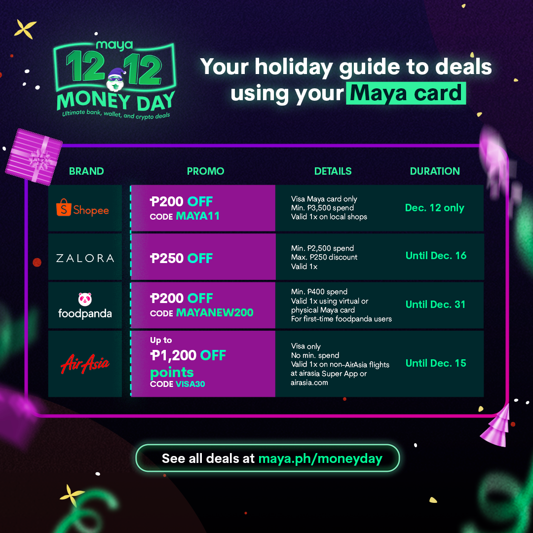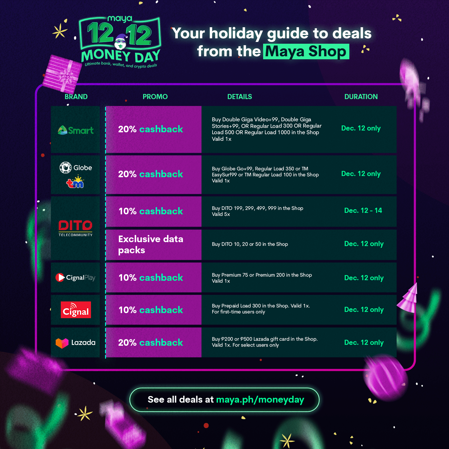 Check out Maya’s #1212MoneyDay cheat sheet below, for a list of all the exciting offers. If you need more info on a certain deal, simply head to https://www.maya.ph/moneyday.