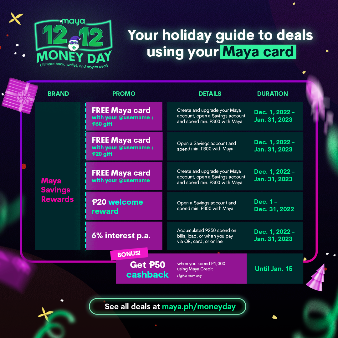 MANILA, Philippines—With holiday carols playing in each corner of the world, going on a shopping spree is just the perfect hangout with your family. For transactions with much ease, Maya offers an Ultimate Guide for this year’s #1212MoneyDay. This 12.12, enjoy deals up to 30% off, up to P1,212 cashback on your bills, a free Maya Card with username plus cashback, a chance to win P100,000 when you activate your Maya credit, and so much more.