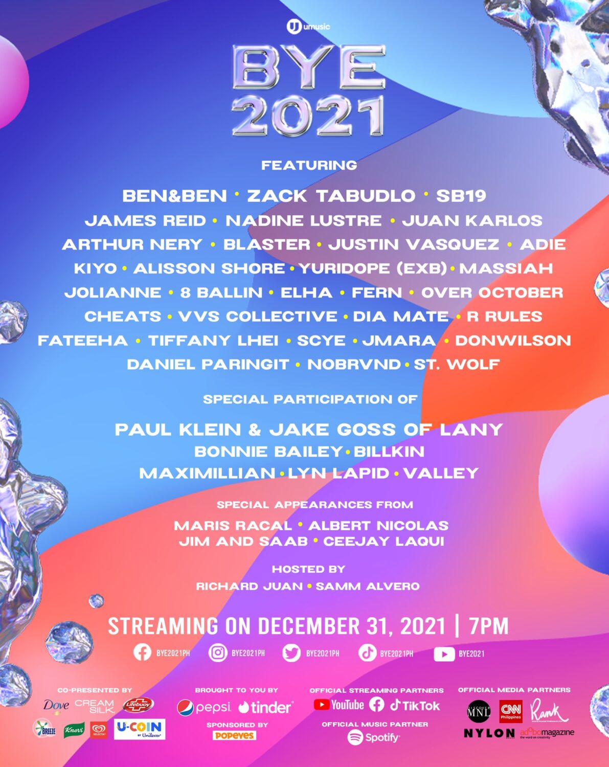 BYE2021 is co-presented by Dove Hair, Creamsilk, Lifebuoy, Dove Skin Cleansing, Breeze, Knorr, Selecta, and U-COIN by Unilever. This event is also brought to you by Pepsi and Tinder; sponsored by Popeyes; with official streaming partners, YouTube, Facebook, and TikTok; and official music partner, Spotify.
