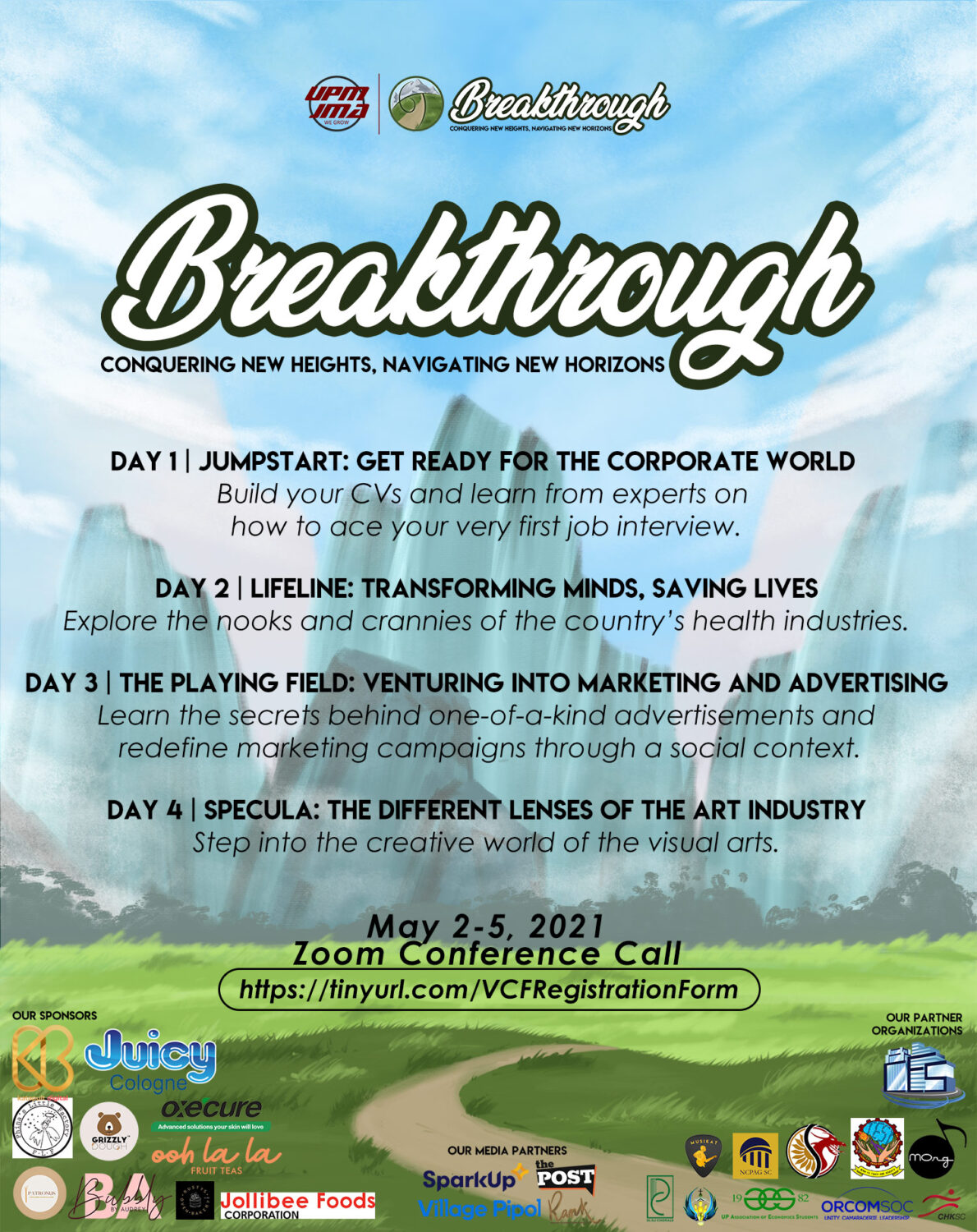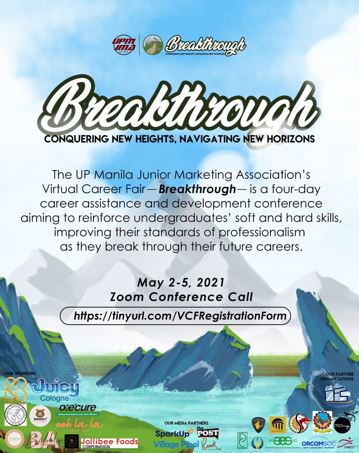 With this, the UP Manila Junior Marketing Association, the sole and premier marketing organization of the University of the Philippines Manila, brings forth, “The Virtual Career Fair” starting on May 2-5, 2021, from 2PM to 5PM via Zoom conference, with the theme, “Breakthrough: Conquering New Heights, Navigating New Horizons.”