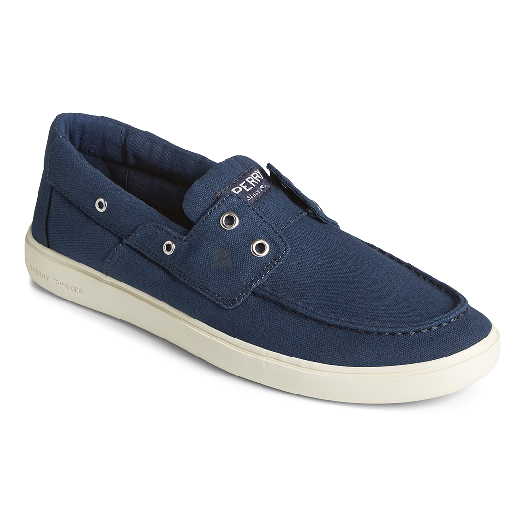 The Sperry Men’s Outer Banks 2-Eye Canvas Boat Shoe in Navy (P4590). Image courtesy of Sperry