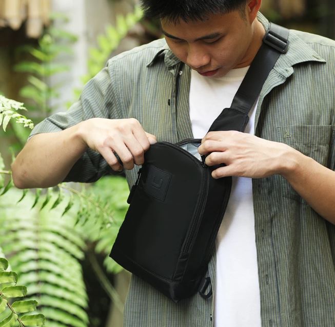 An ideal commute-friendly sling bag for students, featuring VirashieldTM AG Nano Silver Self-Disinfecting Pocket, SafelightTM road safety reflective panel, organizational pockets, and a hideaway tumbler/umbrella holder.