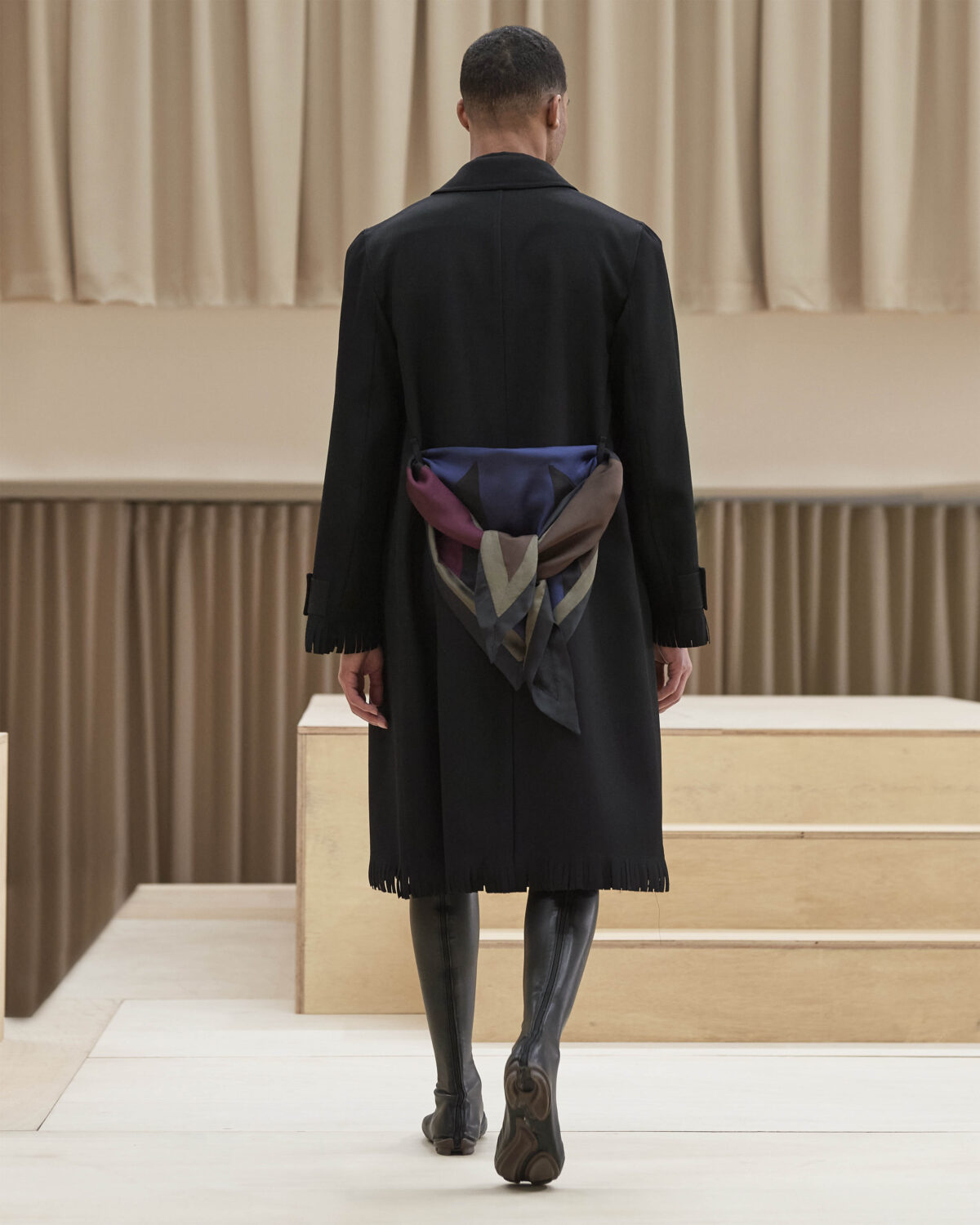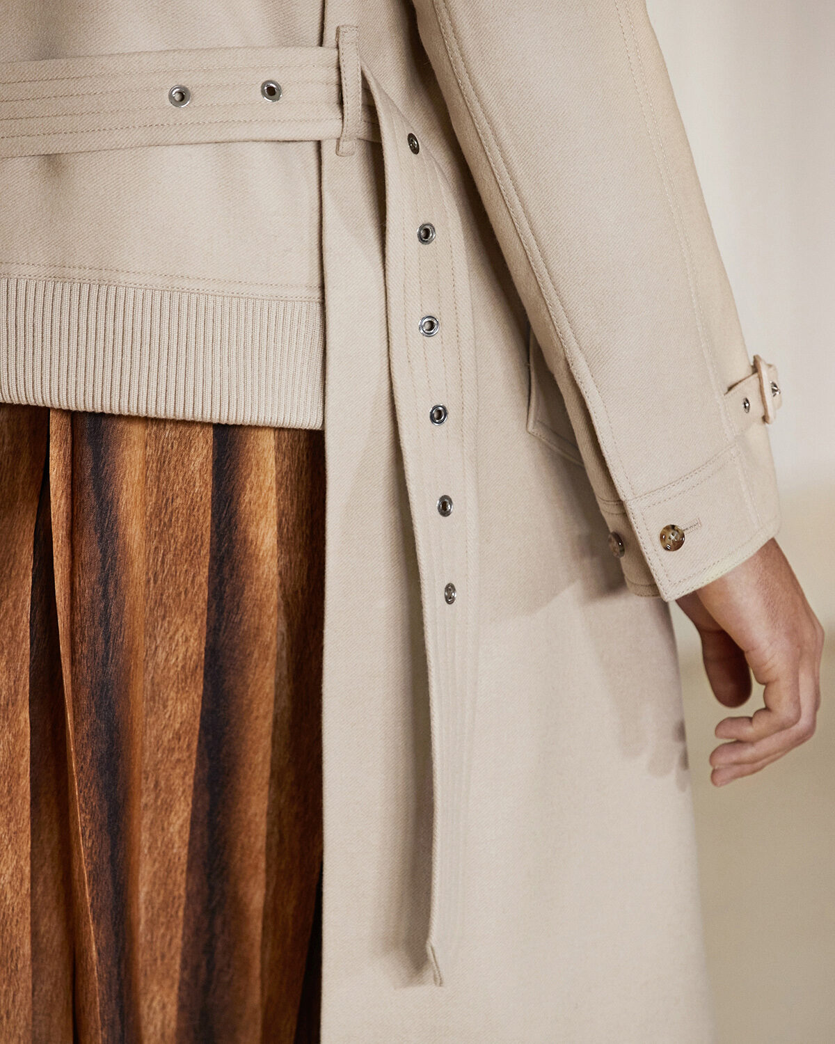 Clothes are engineered to reflect motion and activity – with pleats, panels and fringes – as if moving in the wind. Layered pieces morph unexpectedly on the body. Tailoring has a sense of twisted classicism, whilst Burberry’s quintessential house codes – the trench coat and Burberry beige – are evolved.