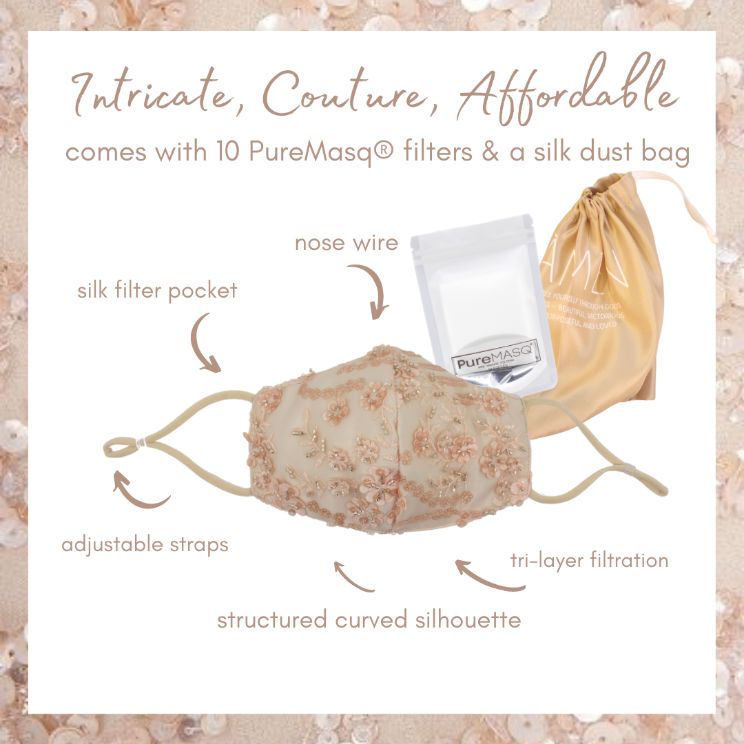 ÀMEN mask has passed the 4 Crucial Safety Test of The MASQ Collection standard. Each mask has nose contours and curve-structured silhouette for breathability; contains a silk pocket for filters; has adjustable ear straps that makes it comfortable to use; is uniquely and intricately designed (no 2 masks are the same); and each purchase comes with 10 sheets of PureMASQ Filters and a silk dust bag.