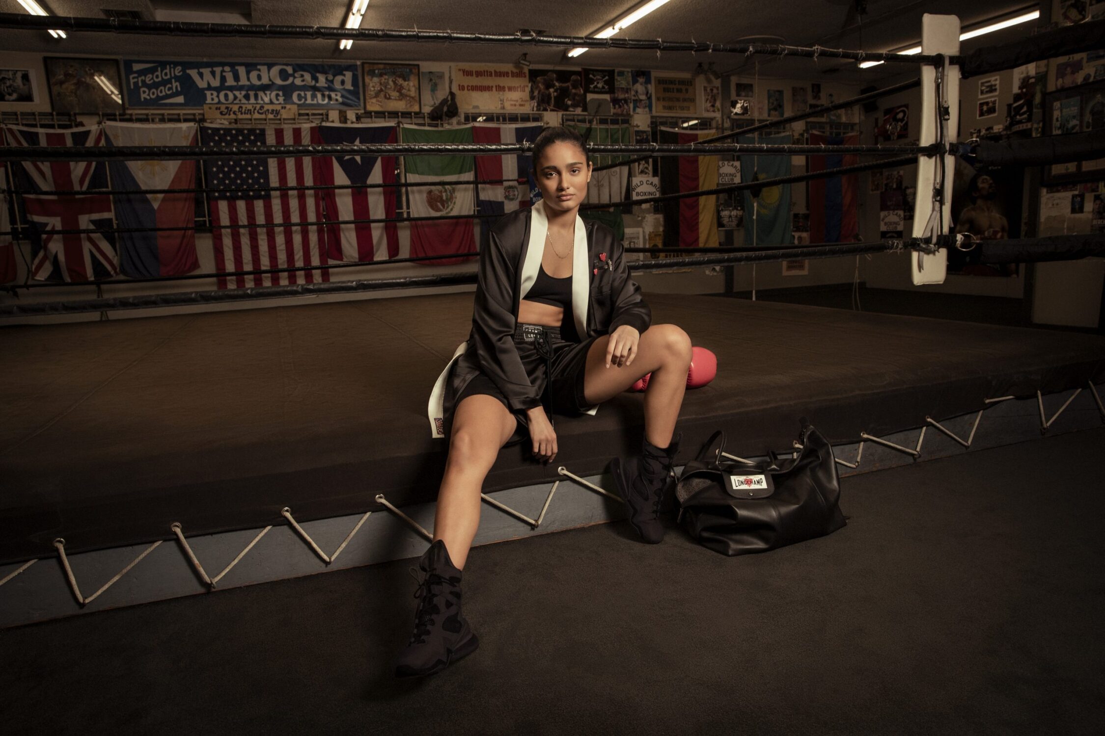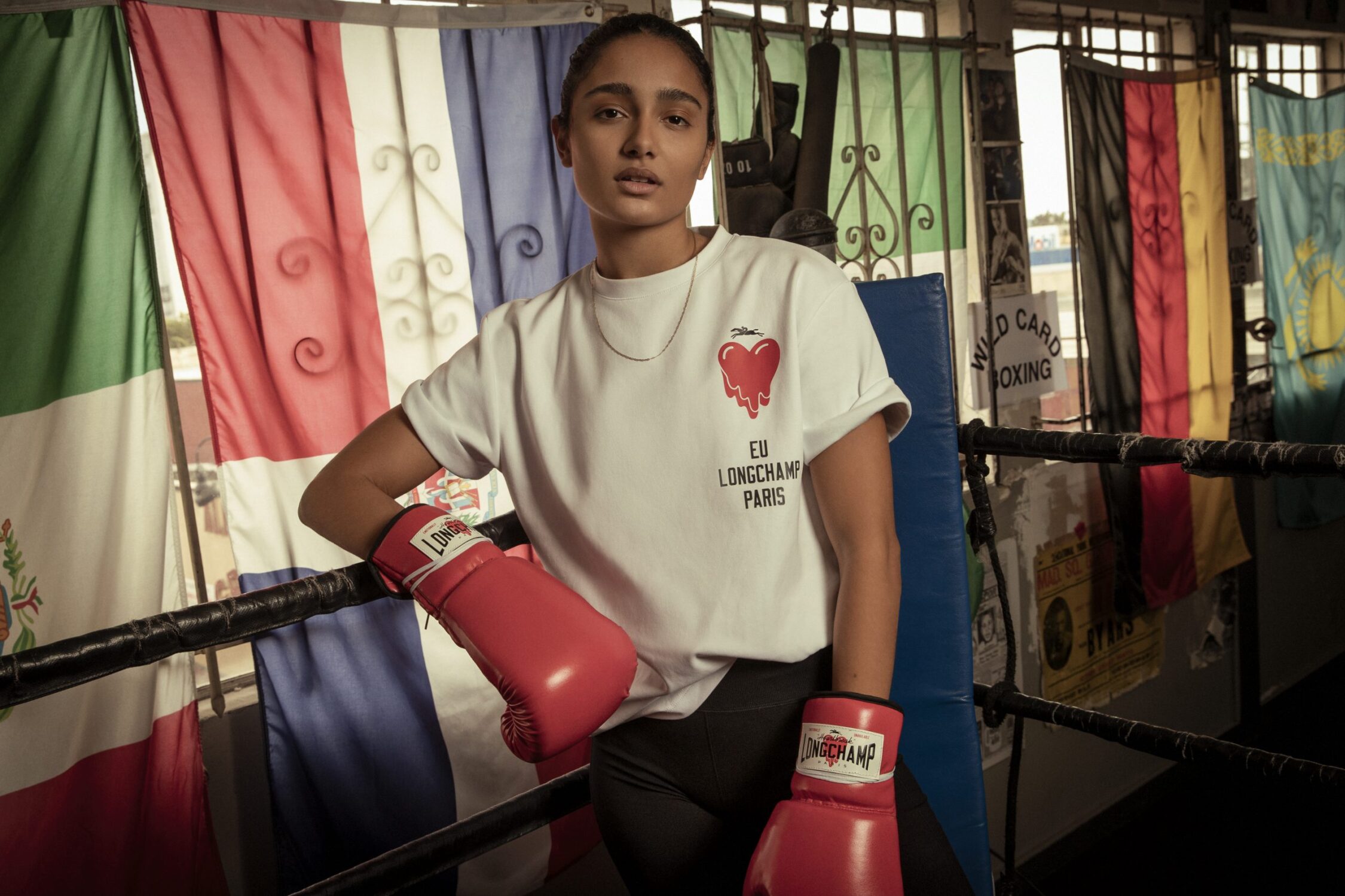 The line hints at the design duo’s inspiration, which is the mind-set of the champion boxer, who fights on even when he’s down. However, their wider message – that, with the same mind-set, we can all be champions in life – also echoes the optimistic, dynamic attitude of Longchamp. Boldly emblazoned in white on the black Le Pliage® bags, this slogan is accompanied by the tongue-in-cheek “Professional Heartbreaker”, a nod to EU’s cult bleeding heart logo.