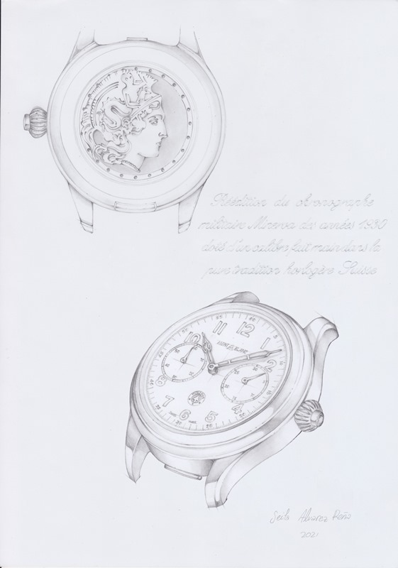 The inside of the cover bears the inscription: “Ré-édition du chronographe militaire Minerva des années 1930 doté d’un calibre fait main dans la pure tradition horlogère suisse” (Re-edition of a Minerva military chronograph from the 1930s equipped with a hand-made calibre following the Swiss watchmaking tradition).