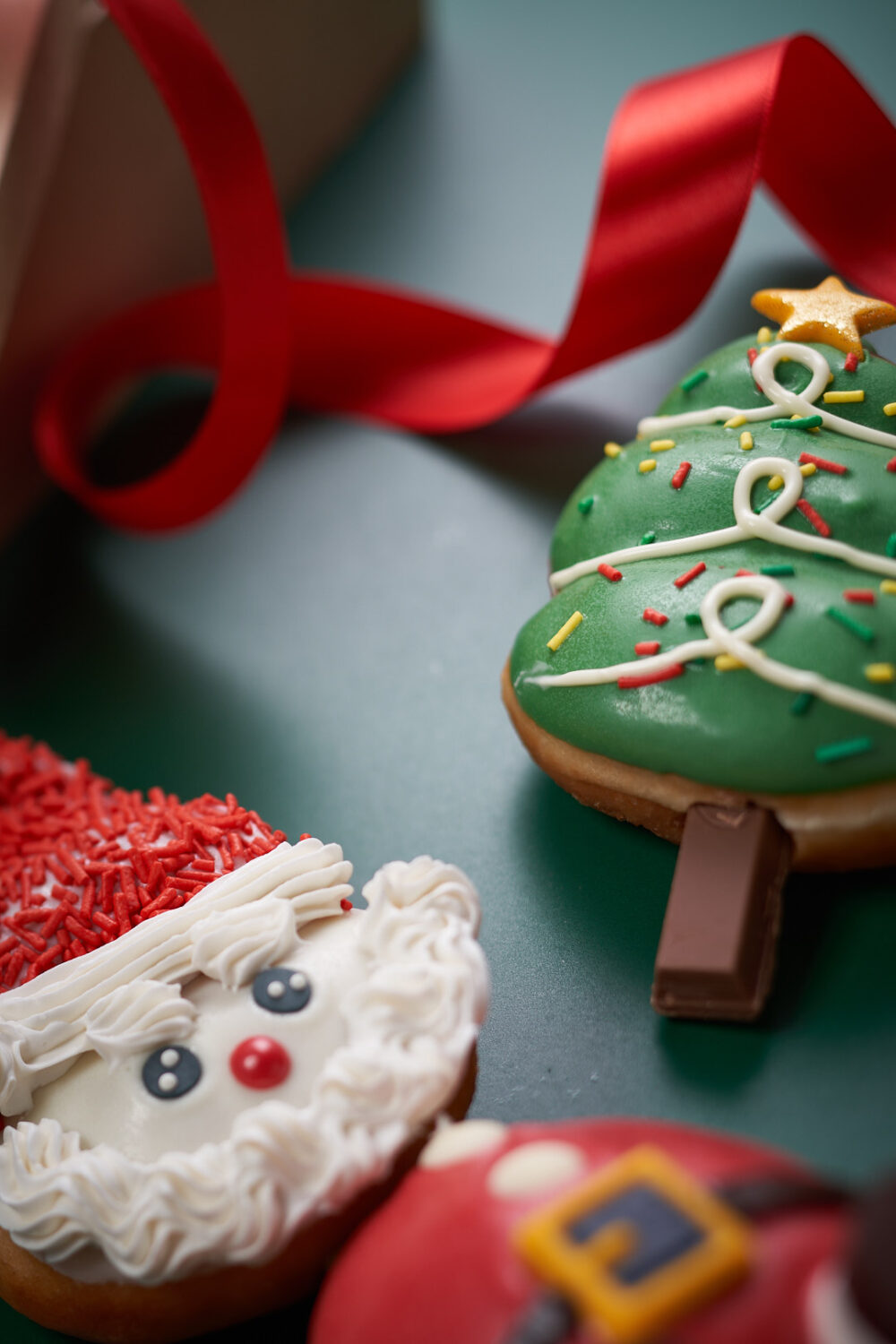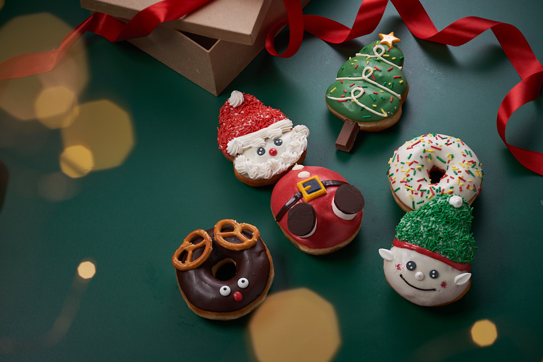 Joining the festivities is Jolly the Elf, a whimsical doughnut filled with kreme, dipped in velvety white chocolate, and playfully decorated with green sprinkles, mallows, red and dark chocolate, kreme, and a sprinkle of cherry disco dust. The dependable Rudolph the Reindeer, presented as a ring doughnut dipped in decadent dark chocolate, takes center stage with pretzels, a red chocolate coating, and an endearing eye candy topper.