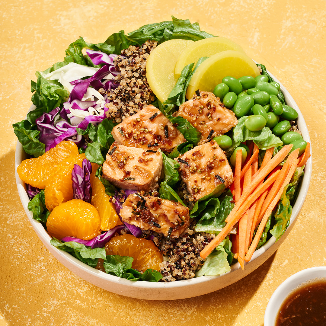 Indulge your senses in a delectably gratifying experience that harmonizes the textures and flavors of quinoa, romaine, red and white cabbage, carrots, pickled daikon, edamame, mandarin oranges, and furikake, all adorned with a Teriyaki Dressing that imparts an irresistible umami kick. Packed with health benefits, this bowl stands as a protein powerhouse—heart-healthy, nut-free, and devoid of added sugars. It’s a delightful win-win for both the body and the spirit!