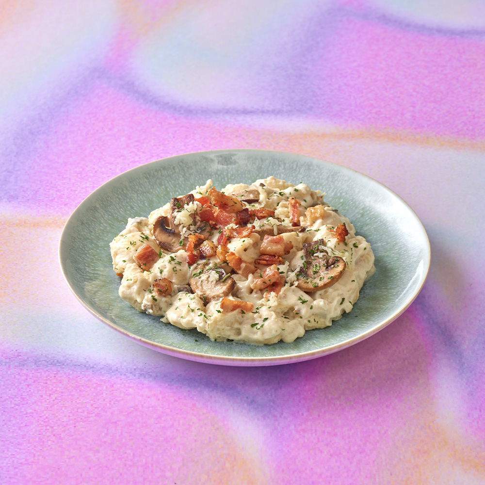 Satisfy cravings with the Smoked Bacon and Mushroom Bake—a pasta masterpiece comprising al dente cocciole pasta tossed in creamy cheese sauce. Topped with sliced smoked bacon, guanciale, mushroom, and mozzarella, this savory dish is finished with chopped parsley. Enhance the flavors by pairing it with a Cold Brew, priced at Php 235.