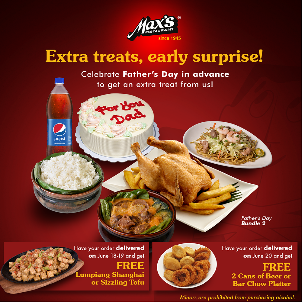 MANILA, Philippines – As Father’s Day nears, Max’s Restaurant is offering two early feasts for advance delivery meant for every kind of dad–a surprise made extra special with these Father’s Day Bundles.