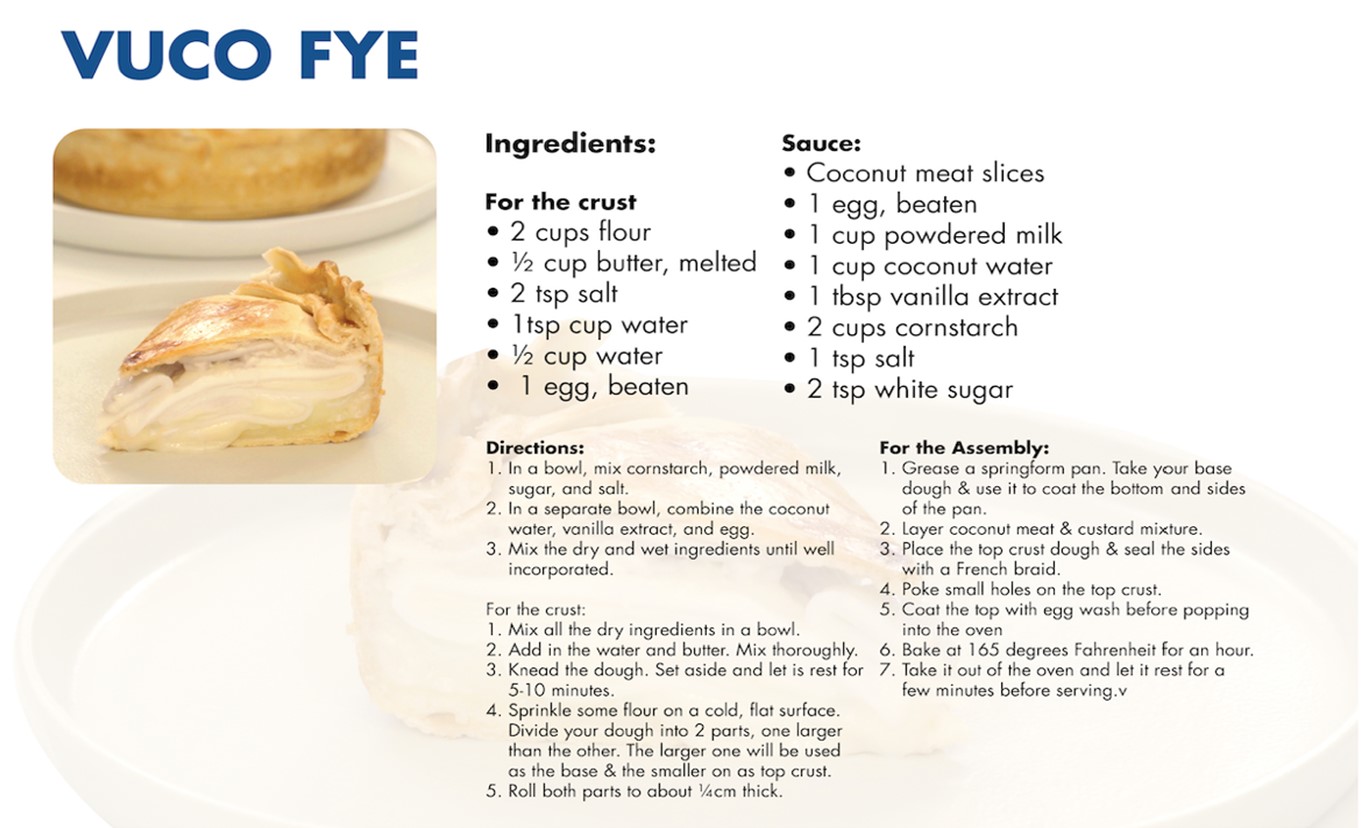 He also shares the recipe for his most recent chart-topper: the buttery Vuco Fye. The pastry is a Kapampangan wordplay on buko pie and the result of him trying his hand at baking to cope with his pandemic-induced depression. His secret to this filling goodness? Quality and fresh ingredients.