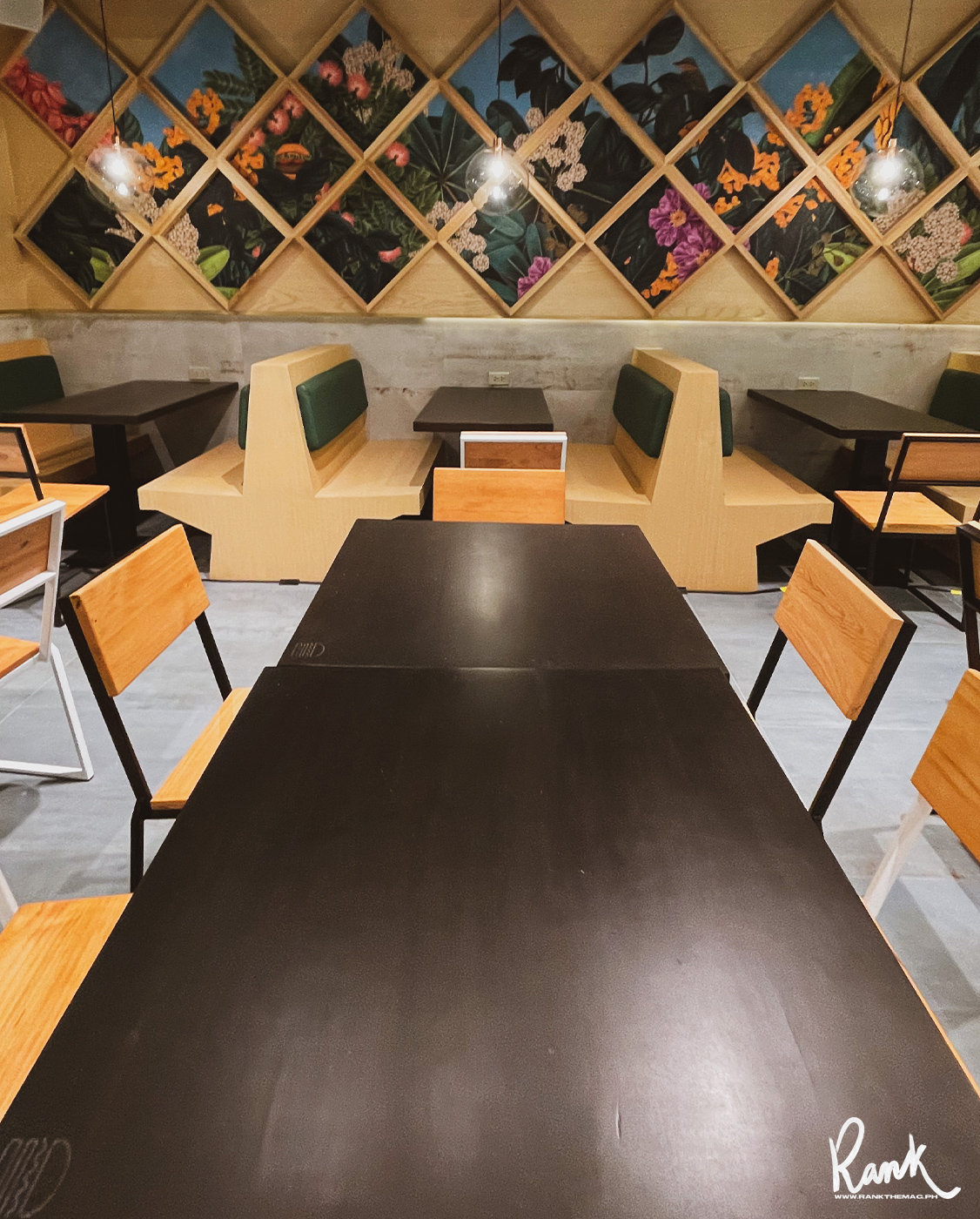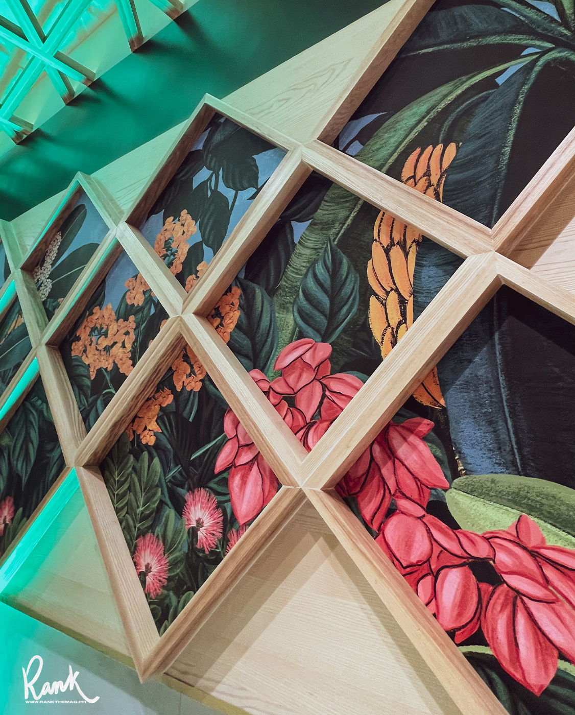 Inside the Shack, she visually translates her Philippine flora and fauna piece into 73 polygon diagrams spanning the outlet’s long dining space, providing pops of color in the interiors natural finish.