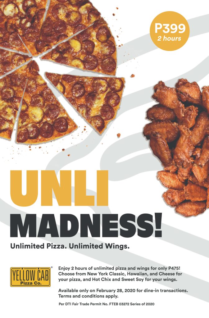 “We know our diners have a huge appetite for our New York-style pizzas and expertly fried wings. That is why we are letting them enjoy these classics to their hearts’ content,” shares Charlene Sapina, Marketing Head of Yellow Cab Pizza Co. “Mark your calendars and dine with us on February 28 and celebrate your maddening love for pizza and wings with our Unli Madness deal!”