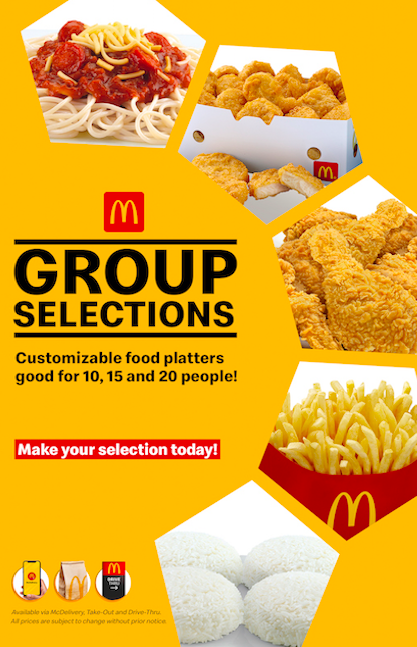 With this initiative, customers are able to mix and match from the five (5) Group Selections food products depending on their preference and budget. Included in the offers such as World Famous French Fries, Best Tasting Chicken McDo (original and spicy), Chicken McNuggets, McSpaghetti and plain rice.