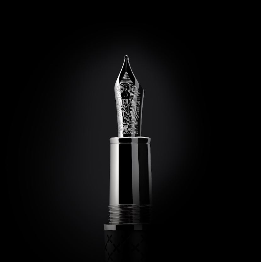 The Montblanc emblem on the pen top features an elevated skull and crossbones motif. Inscriptions include Stevenson’s requiem quote and his signature with the year 1866, marking his first publication. The fountain pen’s solid gold nib bears a special embossing of “TUSITALA” and sea waves, symbolizing Stevenson’s journey to Samoa.
