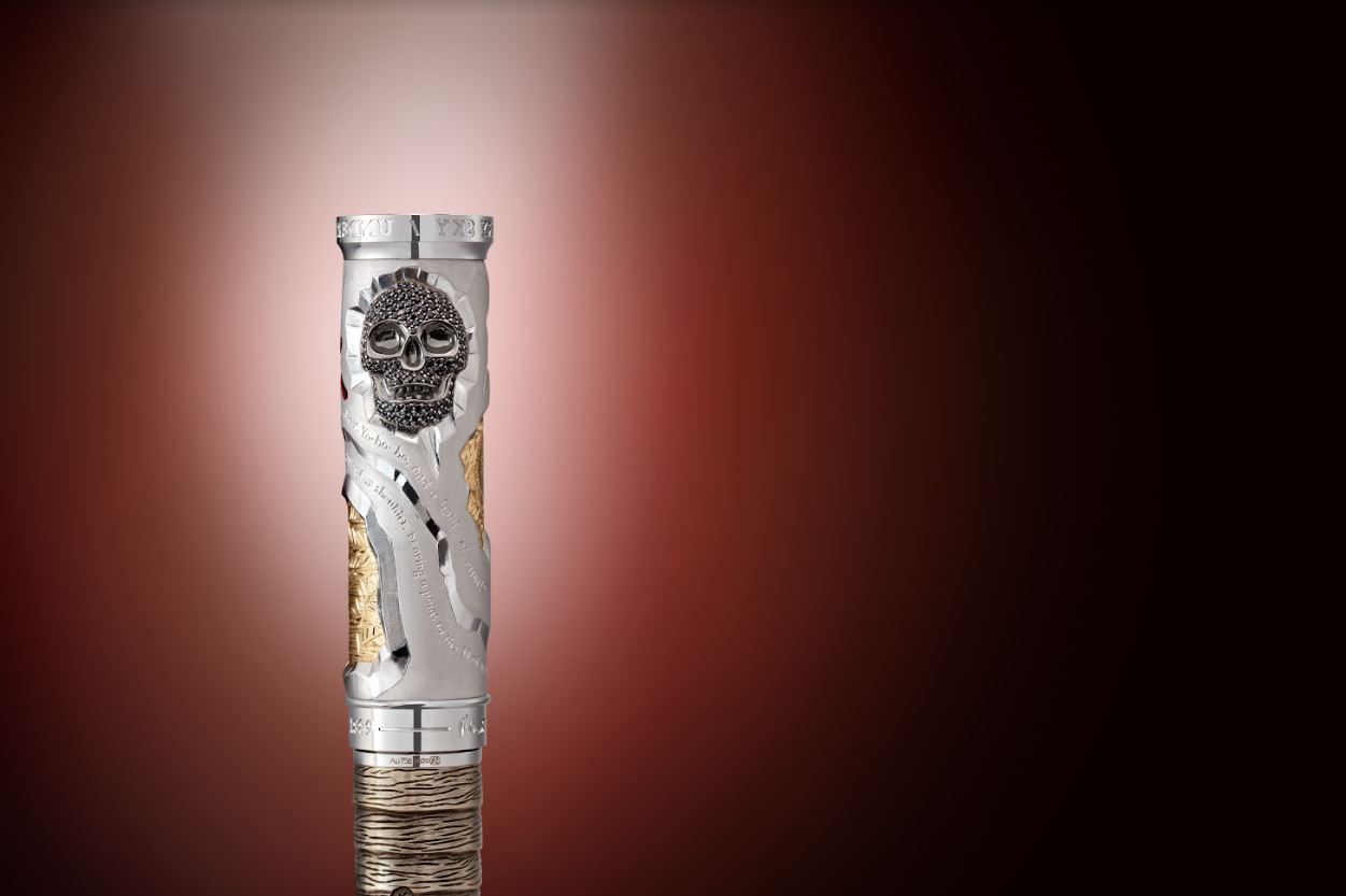 The cone, forepart, and fittings are composed of solid Au 750 yellow gold, featuring the silhouette of the “Casco,” the ship Stevenson used to leave North America, on the cone. The cap ring bears the author’s signature and the year 1888, signifying Stevenson’s departure from San Francisco aboard the Pacific Ocean-bound vessel. The solid Au 750 bi-color gold nib displays the embossing “TUSITALA” and a palm leaf design, symbolizing Stevenson’s arrival in Samoa. The fountain pen’s Montblanc emblem is enhanced with a 3D skull in Ag 925 sterling silver, surrounded by translucent lacquer.
