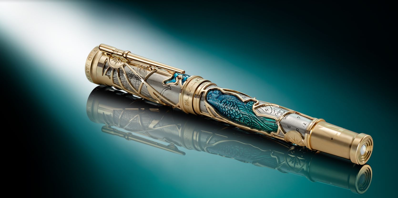 The limited edition Fountain Pen and Rollerball, part of the Writers Edition Homage to Robert Louis Stevenson Limited Edition 1883, are meticulously crafted with metal and precious lacquer. The collection is themed around Stevenson’s iconic work “Treasure Island.” The barrel showcases the ship “Hispaniola,” with a unique mechanism transforming its flag from British Red Ensign to Jolly Roger.