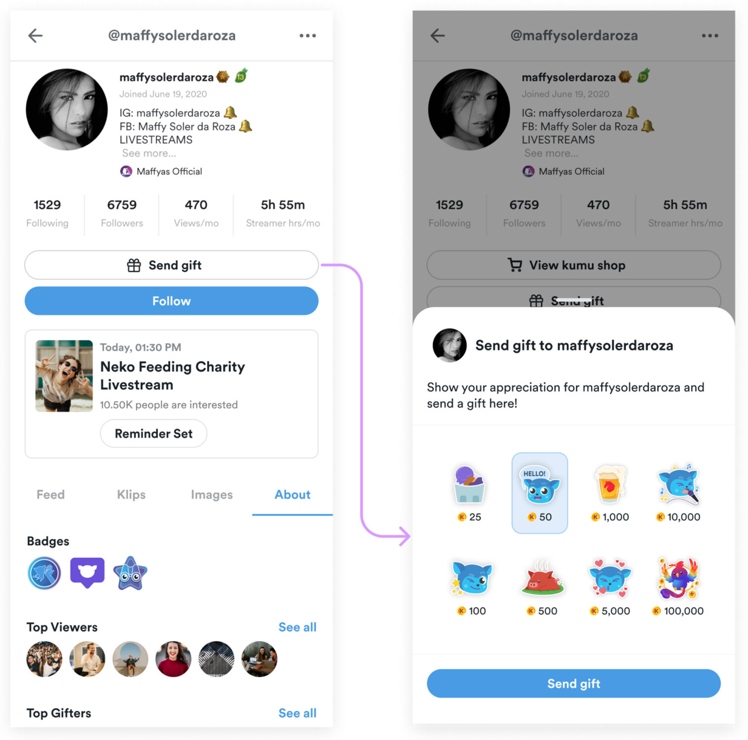 There’s no need to wait for your favorite Kumu creator to go live with the improved Send a Gift feature, which is now accessible on the Android and iOS apps. Simply browse to their profile and click to send a virtual gift.