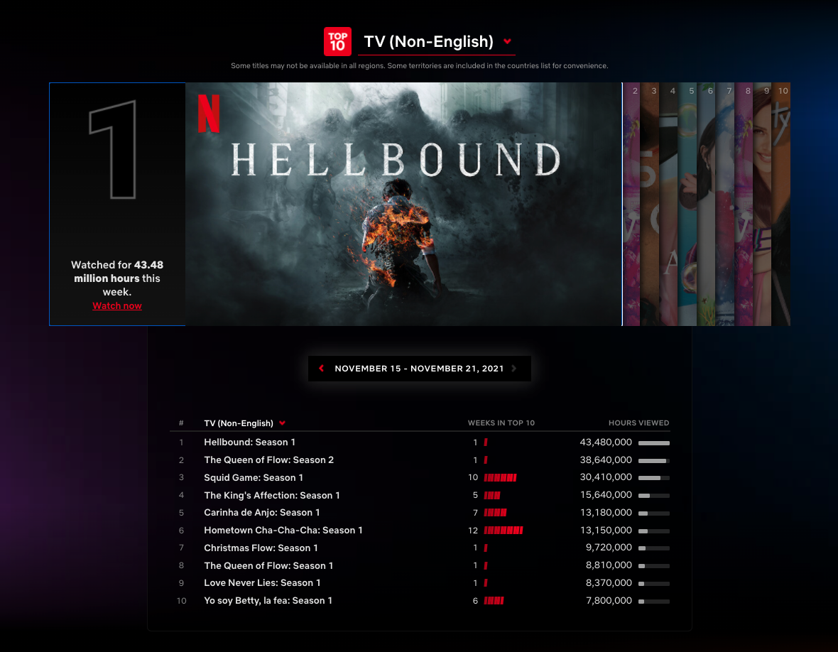 Also landed in the Top 10 List in 59 countries including India, US, France and Germany. This result is more outstanding considering Hellbound’s record only includes 3 days’ sum of the viewing hours out of the week (November 15th to 21st) since its release was on Nov 19th.