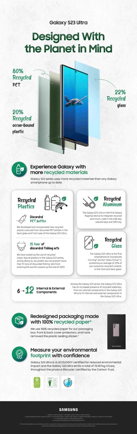 All the Galaxy S23 series’ new standard-setting innovations are housed within a striking design that advances the company’s sustainability commitment with more components made using recycled materials than any other Samsung Galaxy smartphone.