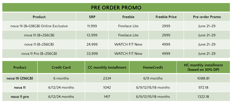 Installment payments in Offline Huawei Stores are also available via Home Credit for up to 18 months and participating credit cards for up to 24 months. Trade in options for the 256G nova 11 and 11 Pro with maximum values of up to Php8,030 can also be applied for your purchase.