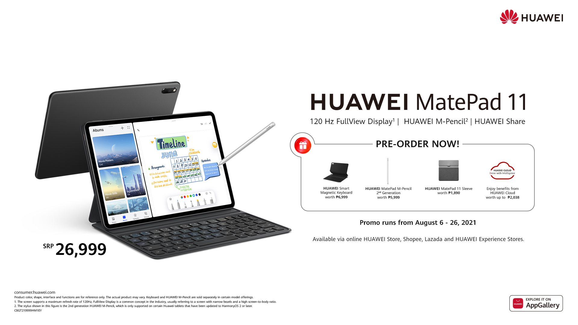 This amazing offer will only be available for pre-order from August 6 – 26 via the official Huawei Experience Stores and online through Huawei Store, Shopee, and Lazada. #HUAWEIMatePad11PH #MadebyMatePadPH