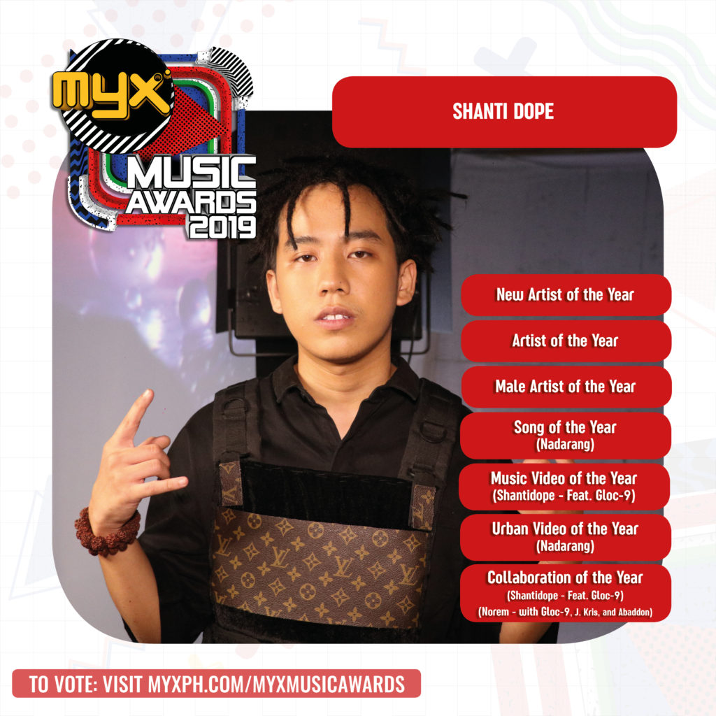 Shanti Dope is nominated in seven categories including New Artist of the Year, Male Artist of the Year, and Artist of the Year. His single “Nadarang” is a contender for Song of the Year and Urban Video of the Year while the track “Shantidope” featuring his mentor Gloc-9 got nominations for Collaboration of the Year and Music Video of the Year.