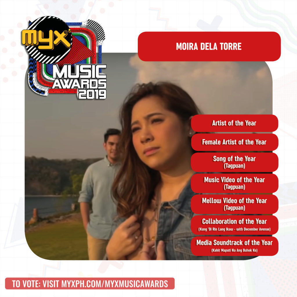 Moira dela Torre received a total of seven nods as well including Mellow Video of the Year, Song of the Year, and Music Video of the Year for “Tagpuan” as well as Female Artist of the Year and Artist of the Year. She’s also nominated for Media Soundtrack of the Year for “Kahit Maputi Na Ang Buhok Ko” and Collaboration of the Year for “Kung Di Rin Lang Ikaw” with December Avenue.