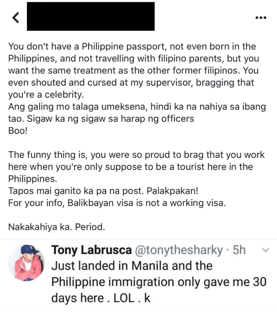To date, no known evidence has been released pertaining to the altercation of the actor, Tony Labrusca with the Immigration Officer. Apart from the online posts of supposed “witnesses”, no video clips nor other evidentiary support has been brought to the attention of the public to substantiate serious allegations and claims on his combative behavior nor his unacceptable demands for fervor because of his “popularity” as a “celebrity”, which he, of course, refutes.
