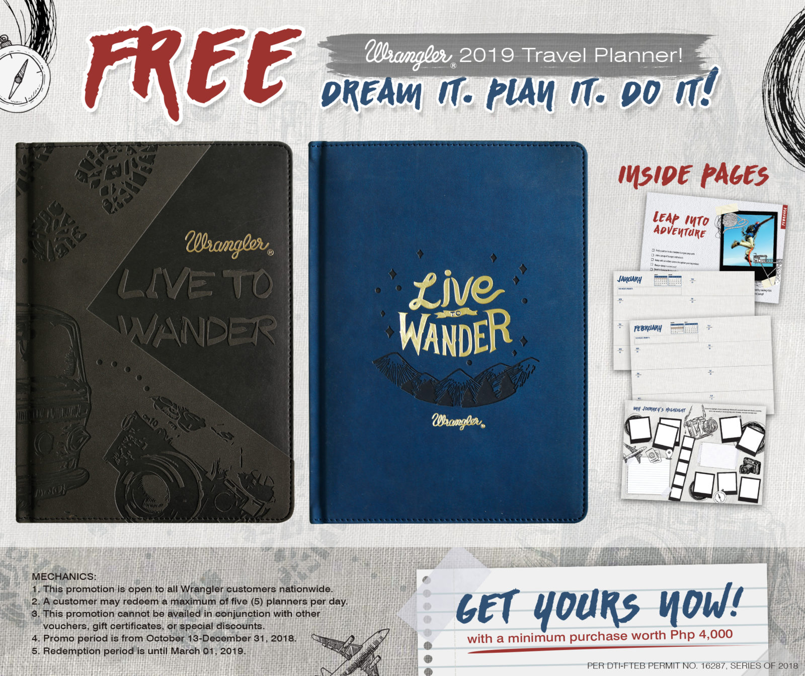 If you’ve grown weary of your daily activities, maybe now is the time to spice things up a bit by getting your 2019 Travel Planner today! Visit your nearest Wrangler store and grab yours for free with a minimum purchase Php4000! Their VIP members, on the other hand, can get it for free with a minimum purchase worth Php3500 only.