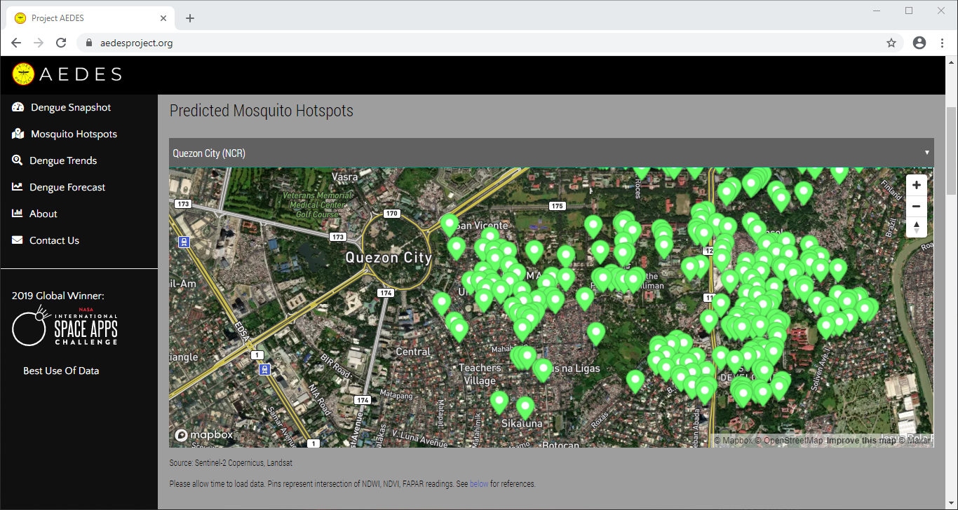 Correlating information from Sentinel-2 Copernicus and Landsat 8 satellites, climate data from the Philippine Atmospheric, Geophysical and Astronomical Services Administration of the Department of Science and Technology (DOST-PAGASA) and trends from Google search engines, potential dengue hotspots will be displayed and demonstrated in the web interface.